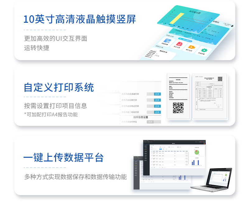 | 安卓智能操作系統(tǒng),采用更加**和人性化操作,儀器具有無線聯(lián)網(wǎng)上傳功能,快速上傳數(shù)據(jù),進(jìn)行數(shù)據(jù)統(tǒng)計和分析。 | 智能化程度高,儀器具有自檢功能:具有開機(jī)自檢和調(diào)零功能,具有自動檢測重復(fù)性功能;同時,檢測完成可自動打印檢測報告和二維碼。手機(jī)掃碼可顯示出詳細(xì)檢測信息。 | 儀器帶有監(jiān)管平臺,數(shù)據(jù)可局域網(wǎng)和互聯(lián)網(wǎng)數(shù)據(jù)上傳,檢測結(jié)果直接傳至食品安全監(jiān)管平臺。進(jìn)行區(qū)域食品安全監(jiān)管及大數(shù)據(jù)分析處理與數(shù)據(jù)統(tǒng)計,檢測區(qū)域食品安全長短期動態(tài),達(dá)到食品安全問題預(yù)估、預(yù)警 。 | 樣品處理簡單省力,整體操作快速、安全、便捷。 | 儀器具有自身保護(hù)功能,可設(shè)置用戶名及密碼,防止非工作人員操作等。 | 內(nèi)置強(qiáng)大的數(shù)據(jù)庫,可在儀器上直接選擇樣品名稱、檢測指標(biāo)、送檢單位等信息,也可在儀器上直接編輯錄入樣品名稱、檢測指標(biāo)、送檢單位等信息并保存進(jìn)樣品數(shù)據(jù)庫,方便后期操作調(diào)取使用。 | 儀器具有重新校準(zhǔn)、鎖定、恢復(fù)出廠設(shè)置功能。 |
