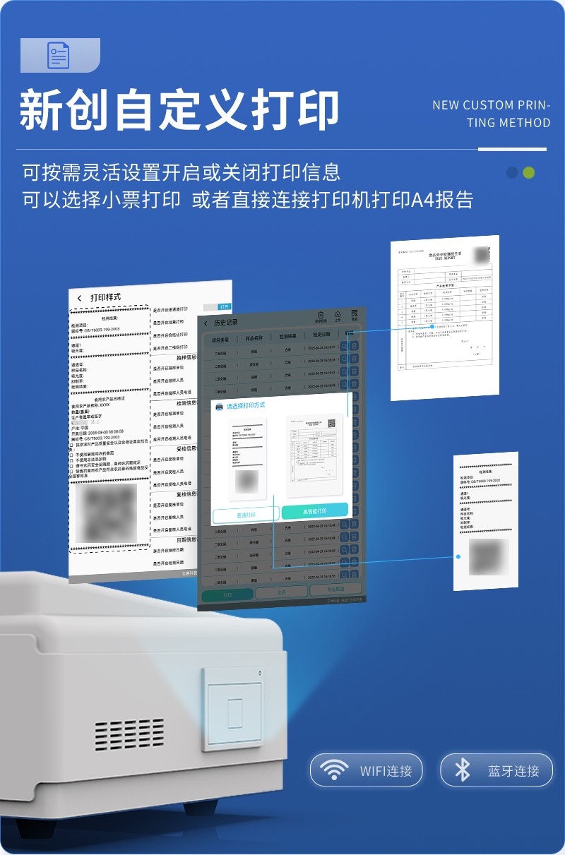 | 儀器采用手提一體化系統(tǒng)檢測技術(shù),將分光光度模塊、數(shù)字化管理模塊、無線通訊模塊高度集成于一體,可支持檢測60種食品安全檢測項(xiàng)目,同時(shí)預(yù)留升級檢測方法。 | 儀器檢測模塊標(biāo)準(zhǔn)化、智能化,檢測項(xiàng)目可隨意自由組合。檢測箱體內(nèi)置多個(gè)標(biāo)準(zhǔn)檢測單元,檢測模塊可以調(diào)整配置。 | 儀器采用全新安卓智能系統(tǒng),主控芯片采用 ARM Cortex-A7,RK3288/4核處理器,10.1寸高清液晶觸摸豎屏,更加**的UI交互界面,運(yùn)轉(zhuǎn)快捷;儀器配備無線通信模塊: 4G(APN)通訊模塊、Wifi模塊,藍(lán)牙傳輸,同時(shí)具有雙USB接口以及RJ45接口能以多種方式實(shí)現(xiàn)數(shù)據(jù)保存和數(shù)據(jù)傳輸功能。 | 顯示屏幕:儀器采用10.1英寸豎向液晶觸摸屏顯,搭配運(yùn)行安卓智能操作系統(tǒng),主控芯片采用ARM Cortex-A7,RK3288/4核處理器,主頻1.88Ghz,操作方便,性能更強(qiáng)。 | 檢測通道:≥12通道;采用精密旋轉(zhuǎn)比色池設(shè)計(jì),使用同芯片同光源校準(zhǔn)精度,解決不同光源之間的誤差值,更加準(zhǔn)確**。(1-12通道間誤差0.1%,**號:ZL202022821055.2) | 儀器光源:高精度進(jìn)口四波長冷光源,每個(gè)通道均配置 410、520、590、630nm 波長光源,標(biāo)配**的光路切換裝置,**光路切換功能可實(shí)現(xiàn)64波長,并且所有檢測項(xiàng)目可實(shí)現(xiàn)所有通道同時(shí)檢測。 | 設(shè)備可一鍵校準(zhǔn),自動(dòng)保存校準(zhǔn)數(shù)據(jù),自動(dòng)對比校驗(yàn),得到精準(zhǔn)光源,采用Android SP存儲(chǔ)數(shù)據(jù),光源數(shù)據(jù)永不丟失,方便每一次使用。 | 通訊接口:配備無線通信模塊、4G(APN)通訊模塊、藍(lán)牙傳輸,同時(shí)具有雙USB接口以及RJ45網(wǎng)線接口,可以多方式實(shí)現(xiàn)數(shù)據(jù)保存及數(shù)據(jù)傳輸。 | 存儲(chǔ)方式:支持U盤存儲(chǔ),標(biāo)準(zhǔn)USB接口,免驅(qū)動(dòng)安裝。檢測結(jié)果存儲(chǔ)容量20萬條以上,可生成Excel表格進(jìn)行拷貝,并具有登錄保護(hù)功能。 | 智能化操作系統(tǒng): | 1、操作系統(tǒng):儀器可在同一檢測界面自動(dòng)對應(yīng)相關(guān)檢測通道,一次性選擇1-12個(gè)樣品名稱,無需退出界面,節(jié)省操作時(shí)間。并可以對每個(gè)通道屬性和樣品信息單獨(dú)進(jìn)行編輯,例如送檢單位、人員,檢測人員等,打印時(shí)勾選打印顯示。 | 2、數(shù)據(jù)集成系統(tǒng):設(shè)備首頁自動(dòng)匯總分析檢測數(shù)據(jù),包含:周檢測數(shù)據(jù)、月檢測數(shù)據(jù),全部檢測總數(shù)量,均包含檢測總數(shù),合格數(shù),不合格數(shù),以及相關(guān)柱形分析圖,各項(xiàng)檢測數(shù)據(jù)一目了然,無需電腦查詢,更加快捷直觀。 | 3、數(shù)據(jù)庫系統(tǒng):十幾項(xiàng)數(shù)據(jù)庫分類管理儀器:包含項(xiàng)目類型、項(xiàng)目數(shù)據(jù)、檢測數(shù)據(jù)、歷史記錄、國標(biāo)信息、曲線信息、采樣信息、檢測信息、受檢信息、復(fù)核信息、圖表信息、光源校準(zhǔn)信息、打印樣式信息、樣品庫信息等等,數(shù)據(jù)庫之間互相協(xié)調(diào)聯(lián)動(dòng)保證數(shù)據(jù)的真實(shí)完整性。同時(shí)產(chǎn)品數(shù)據(jù)庫以及歷史檢測記錄支持一鍵檢索功能。 | 4、限量規(guī)判系統(tǒng):具有限量查詢、添加物質(zhì)合規(guī)判定系統(tǒng)。檢測出結(jié)果后,系統(tǒng)自動(dòng)調(diào)用系統(tǒng)數(shù)據(jù)庫中相關(guān)國標(biāo)進(jìn)行比對判定,客觀顯示判定結(jié)果是否合格。 | 5、項(xiàng)目預(yù)設(shè)系統(tǒng):儀器具有任務(wù)預(yù)設(shè)模塊,一鍵提前預(yù)設(shè),給出方便快捷的新檢測方案,每一個(gè)任務(wù)分別可以設(shè)置不同的樣品、批次、編號、來源、備注、抽樣信息、檢測信息、受檢信息、復(fù)核信息等更多信息。樣品送檢時(shí)一鍵調(diào)取保存信息,并可多次調(diào)取,大大提高檢測效率。 | 6、數(shù)據(jù)監(jiān)管系統(tǒng):同步對接監(jiān)管平臺(tái),數(shù)據(jù)可局域網(wǎng)和互聯(lián)網(wǎng)數(shù)據(jù)上傳,檢測結(jié)果可選擇直接傳至食品安全監(jiān)管平臺(tái)。進(jìn)行區(qū)域食品安全監(jiān)管及大數(shù)據(jù)分析處理與數(shù)據(jù)統(tǒng)計(jì),檢測區(qū)域食品安全長短期動(dòng)態(tài),達(dá)到食品安全問題預(yù)估、預(yù)警。 | 7、全新打印系統(tǒng):內(nèi)置全新打印機(jī),新創(chuàng)自定義打印方式,可按需靈活勾選控制:二維碼,抽樣信息、檢測信息,受檢信息、復(fù)核信息、抽樣日期、檢測日期等信息的打印。 | 8、A4紙版本報(bào)告打印功能(可選配):設(shè)備擁有兩種結(jié)果展示方式,可以自動(dòng)生成A4打印模板和小票打印模板兩種樣式,可通過WiFi及網(wǎng)線等方式鏈接外置打印機(jī)可進(jìn)行打印。 | 供電模式:儀器交直流兩用,直流12V供電,可連接車載電源,可配6ah大容量充電鋰電池,電量可實(shí)時(shí)顯示,方便戶外流動(dòng)測試。 | 儀器具備遠(yuǎn)程升級功能,可定向分客戶分儀器更新,開機(jī)后自動(dòng)更新,并可持續(xù)性免費(fèi)更新系統(tǒng)版本,無需像傳統(tǒng)產(chǎn)品返廠更新,節(jié)省時(shí)間及人力成本并避免了物流運(yùn)輸返廠升級導(dǎo)致設(shè)備損壞的潛