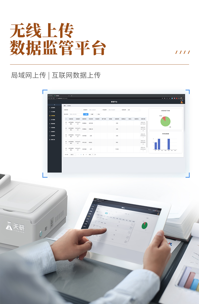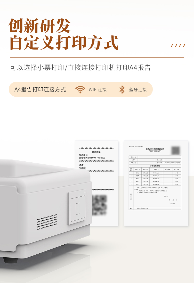 | 儀器采用臺(tái)式一體化系統(tǒng)檢測(cè)技術(shù),將分光光度模塊、數(shù)字化管理模塊、無(wú)線通訊模塊高度集成于一體,支持檢測(cè)200種食品安全檢測(cè)項(xiàng)目,同時(shí)預(yù)留升級(jí)檢測(cè)方法。 | 儀器檢測(cè)模塊標(biāo)準(zhǔn)化、智能化,檢測(cè)項(xiàng)目可隨意自由組合。檢測(cè)箱體內(nèi)置多個(gè)標(biāo)準(zhǔn)檢測(cè)單元,檢測(cè)模塊可以調(diào)整配置。 | 顯示屏幕:儀器采用10.1英寸豎向液晶觸摸屏顯,搭配運(yùn)行安卓智能操作系統(tǒng),主控芯片采用ARM Cortex-A7,RK3288/4核處理器,主頻1.88Ghz,操作方便,性能更強(qiáng)。 | 檢測(cè)通道:≥12通道;采用精密旋轉(zhuǎn)比色池設(shè)計(jì),使用同芯片同光源校準(zhǔn)精度,解決不同光源之間的誤差值,更加準(zhǔn)確**。(1-12通道間誤差0.1%,**號(hào):ZL202022821055.2) | 儀器光源:高精度進(jìn)口四波長(zhǎng)冷光源,每個(gè)通道均配置 410、520、590、630nm 波長(zhǎng)光源,標(biāo)配**的光路切換裝置,**光路切換功能可實(shí)現(xiàn)64波長(zhǎng),并且所有檢測(cè)項(xiàng)目可實(shí)現(xiàn)所有通道同時(shí)檢測(cè)。 | 設(shè)備可一鍵校準(zhǔn),自動(dòng)保存校準(zhǔn)數(shù)據(jù),自動(dòng)對(duì)比校驗(yàn),得到精準(zhǔn)光源,采用Android SP存儲(chǔ)數(shù)據(jù),光源數(shù)據(jù)永不丟失,方便每一次使用。 | 通訊接口:配備無(wú)線通信模塊、可選配4G(APN)通訊模塊和藍(lán)牙傳輸,同時(shí)具有雙USB接口以及RJ45網(wǎng)線接口,可以多方式實(shí)現(xiàn)數(shù)據(jù)保存及數(shù)據(jù)傳輸。 | 存儲(chǔ)方式:支持U盤存儲(chǔ),標(biāo)準(zhǔn)USB接口,免驅(qū)動(dòng)安裝。檢測(cè)結(jié)果存儲(chǔ)容量20萬(wàn)條以上,可生成Excel表格進(jìn)行拷貝,并具有登錄保護(hù)功能。 | 智能化操作系統(tǒng): | 1)操作系統(tǒng):儀器可在同一檢測(cè)界面自動(dòng)對(duì)應(yīng)相關(guān)檢測(cè)通道,一次性選擇1-12個(gè)樣品名稱,無(wú)需退出界面,節(jié)省操作時(shí)間。并可以對(duì)每個(gè)通道屬性和樣品信息單獨(dú)進(jìn)行編輯,例如送檢單位、人員,檢測(cè)人員等,打印時(shí)勾選打印顯示。 | 2)數(shù)據(jù)集成系統(tǒng):設(shè)備首頁(yè)自動(dòng)匯總分析檢測(cè)數(shù)據(jù),包含:周檢測(cè)數(shù)據(jù)、月檢測(cè)數(shù)據(jù),全部檢測(cè)總數(shù)量,均包含檢測(cè)總數(shù),合格數(shù),不合格數(shù),以及相關(guān)柱形分析圖,各項(xiàng)檢測(cè)數(shù)據(jù)一目了然,無(wú)需電腦查詢,更加快捷直觀。 | 3)數(shù)據(jù)庫(kù)系統(tǒng):十幾項(xiàng)數(shù)據(jù)庫(kù)分類管理儀器:包含項(xiàng)目類型、項(xiàng)目數(shù)據(jù)、檢測(cè)數(shù)據(jù)、歷史記錄、國(guó)標(biāo)信息、曲線信息、采樣信息、檢測(cè)信息、受檢信息、復(fù)核信息、圖表信息、光源校準(zhǔn)信息、打印樣式信息、樣品庫(kù)信息等等,數(shù)據(jù)庫(kù)之間互相協(xié)調(diào)聯(lián)動(dòng)保證數(shù)據(jù)的真實(shí)完整性。同時(shí)產(chǎn)品數(shù)據(jù)庫(kù)以及歷史檢測(cè)記錄支持一鍵檢索功能。 | 4)限量規(guī)判系統(tǒng):具有限量查詢、添加物質(zhì)合規(guī)判定系統(tǒng)。檢測(cè)出結(jié)果后,系統(tǒng)自動(dòng)調(diào)用系統(tǒng)數(shù)據(jù)庫(kù)中相關(guān)國(guó)標(biāo)進(jìn)行比對(duì)判定,客觀顯示判定結(jié)果是否合格。 | 5)項(xiàng)目預(yù)設(shè)系統(tǒng):儀器具有任務(wù)預(yù)設(shè)模塊,一鍵提前預(yù)設(shè),給出方便快捷的新檢測(cè)方案,每一個(gè)任務(wù)分別可以設(shè)置不同的樣品、批次、編號(hào)、來(lái)源、備注、抽樣信息、檢測(cè)信息、受檢信息、復(fù)核信息等更多信息。樣品送檢時(shí)一鍵調(diào)取保存信息,并可多次調(diào)取,大大提高檢測(cè)效率。 | 6)數(shù)據(jù)監(jiān)管系統(tǒng):同步對(duì)接監(jiān)管平臺(tái),數(shù)據(jù)可局域網(wǎng)和互聯(lián)網(wǎng)數(shù)據(jù)上傳,檢測(cè)結(jié)果可選擇直接傳至食品安全監(jiān)管平臺(tái)。進(jìn)行區(qū)域食品安全監(jiān)管及大數(shù)據(jù)分析處理與數(shù)據(jù)統(tǒng)計(jì),檢測(cè)區(qū)域食品安全長(zhǎng)短期動(dòng)態(tài),達(dá)到食品安全問(wèn)題預(yù)估、預(yù)警。 | 7)打印系統(tǒng):內(nèi)置全新打印機(jī),新創(chuàng)自定義打印方式,可按需靈活勾選控制:產(chǎn)品合格證(國(guó)家農(nóng)業(yè)部標(biāo)準(zhǔn)要求),二維碼,抽樣信息、檢測(cè)信息,受檢信息、復(fù)核信息、抽樣日期、檢測(cè)日期等信息的打印。 | 供電模式:儀器交直流兩用,直流12V供電,可連接車載電源,可配6ah大容量充電鋰電池,電量可實(shí)時(shí)顯示,方便戶外流動(dòng)測(cè)試。 | 儀器加入遠(yuǎn)程升級(jí)功能,可定向分客戶分儀器更新,開機(jī)后自動(dòng)更新,客戶無(wú)需任何操作,即可升級(jí)全新項(xiàng)目。做到了無(wú)需退換機(jī)器即可實(shí)現(xiàn)實(shí)時(shí)遠(yuǎn)程升級(jí)檢測(cè)儀器。 | 設(shè)備尺寸:(長(zhǎng)*寬*高)440*300*180mm | 儀器加入遠(yuǎn)程升級(jí)功能,可定向分客戶分儀器更新,開機(jī)后自動(dòng)更新,客戶無(wú)需任何操作,即可升級(jí)全新項(xiàng)目。做到了無(wú)需退換機(jī)器即可實(sh