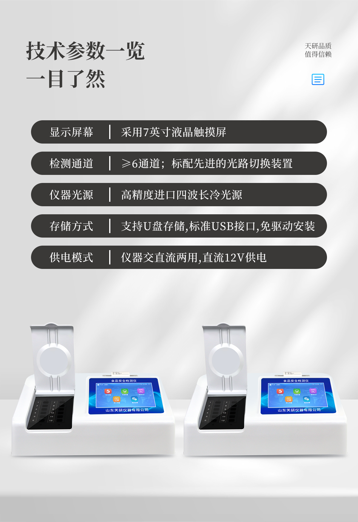 | 主控芯片采用ARM Cortex-A7,RK3288/4核處理器,主頻1.88Ghz,運轉(zhuǎn)速度更快速,穩(wěn)定性更強(qiáng)。 | 直流12V供電,可連接車載電源,可配6ah大容量充電鋰電池,方便戶外流動測試。 | 四波長冷光源,每個通道均配置410、520、590、630nm波長光源,標(biāo)配**的光路切換裝置,**光路切換功能可實現(xiàn)*多64波長,并且所有檢測項目可實現(xiàn)所有通道同時檢測。 | 光源亮度自動調(diào)節(jié)與校準(zhǔn) | 智能恒流穩(wěn)壓,光強(qiáng)自動校準(zhǔn),長時間連續(xù)工作光源無溫漂現(xiàn)象 | 內(nèi)置新國家限量標(biāo)準(zhǔn),與所測結(jié)果進(jìn)行現(xiàn)場比對,并持續(xù)更新標(biāo)準(zhǔn) | 不間斷進(jìn)樣,連續(xù)檢測 | 樣本編號自動累加。 | 檢測項目可擴(kuò)充。 | 檢測結(jié)果可批量打印,批量上傳。 | 數(shù)據(jù)無線上傳平臺,并可從平臺導(dǎo)出為Excel表格。 | 檢測結(jié)果存儲容量20萬條 | 同時支持U盤拷貝,標(biāo)準(zhǔn)USB接口,免驅(qū)動插拔。 | 可配置大容量鋰電池,固件可升級。 | 儀器尺寸;42×31×20。 | 儀器凈重:3.6kg。 |