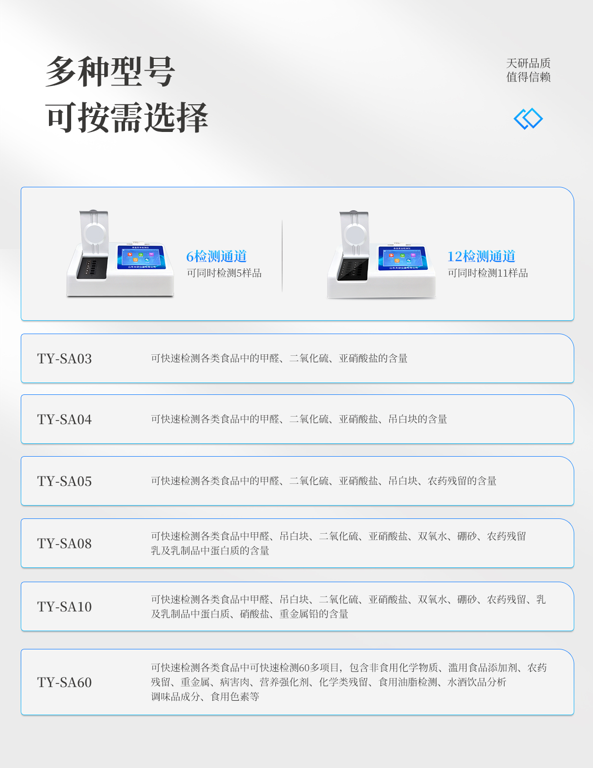 產(chǎn)品介紹:多功能食品安全檢測儀可快速檢測200多項目,包含非食用化學(xué)物質(zhì)、濫用食品添加劑、農(nóng)藥殘留、獸藥殘留、重金屬、病害肉、營養(yǎng)強(qiáng)化劑、抗生素類殘留、激素類殘留、真菌毒素類殘留、化學(xué)類殘留等現(xiàn)場的定性定量檢測。該多功能食品安全檢測儀為集成化食品安全快速檢測分析設(shè)備,廣泛應(yīng)用于市場監(jiān)管局、檢測中心、衛(wèi)生