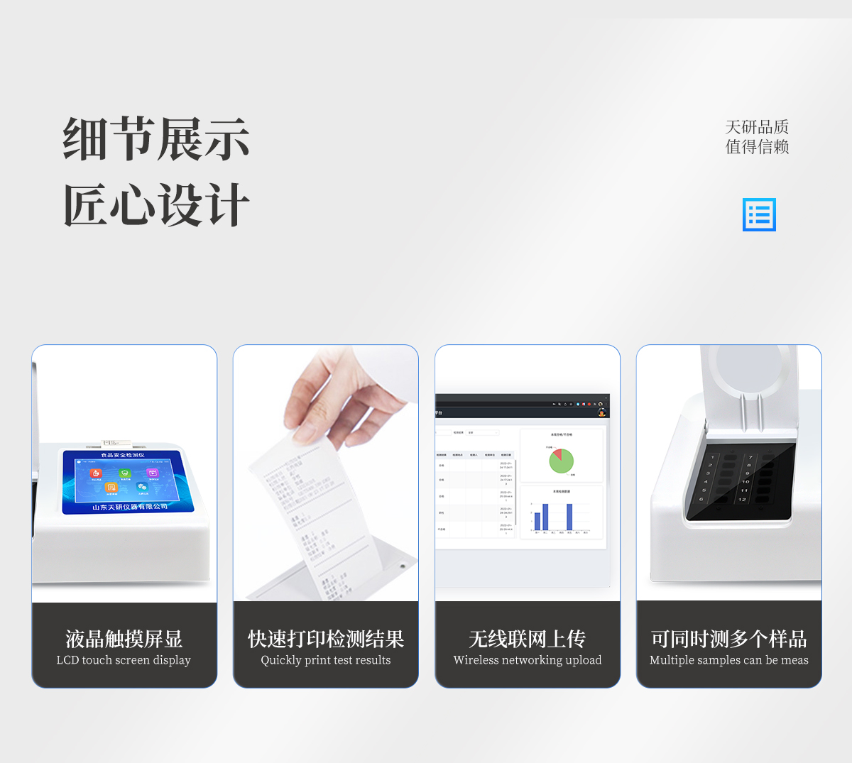| 安卓智能操作系統(tǒng),采用更加**和人性化操作,儀器具有網(wǎng)線連接、wifi聯(lián)網(wǎng)上傳、GPRS無線遠(yuǎn)傳功能,快速上傳數(shù)據(jù)。 | 智能化程度高,儀器具有自檢功能:具有開機(jī)自檢和調(diào)零功能,具有自動檢測重復(fù)性功能。 | 檢測通道:≥12個檢測通道,可以同時測試多個樣品,每個樣品由程序控制分別獨立工作,不會互相干擾。 | 顯示方式:≥8英寸液晶觸摸屏顯示,人性化中文操作界面,讀數(shù)直觀、簡單。 | 配備新一代嵌入式熱敏打印機(jī),可選擇手動打印或者自動打印,檢測完成可自動打印檢測報告和二維碼。 | 光源采用進(jìn)口超高亮發(fā)光二極管,高精度、穩(wěn)定性強(qiáng)、光源可控、可以關(guān)掉不使用的光源,功耗更低。 | 采用USB2.0接口設(shè)計,方便數(shù)據(jù)的存貯和移動,并可隨時與計算機(jī)直接相連,并且可用計算機(jī)控制儀器。實現(xiàn)數(shù)據(jù)查詢、瀏覽、分析、統(tǒng)計、打印等。 | 儀器帶有監(jiān)管平臺。數(shù)據(jù)可局域網(wǎng)和互聯(lián)網(wǎng)數(shù)據(jù)上傳,檢測結(jié)果直接傳至食品安全監(jiān)管平臺。進(jìn)行區(qū)域食品安全監(jiān)管及大數(shù)據(jù)分析處理,檢測區(qū)域食品安全長短期動態(tài),達(dá)到食品安全問題預(yù)估、預(yù)警 | 一體化便攜式快檢設(shè)備,滿足現(xiàn)場及流動檢測使用需求,能夠在同一軟件下實現(xiàn)所有檢測項目的檢測,并可通過同一窗口直觀顯示檢測結(jié)果。 | 儀器具有多品類多種類樣品菜單庫,可靈活選擇檢測樣品,不同的檢測通道可同時檢測不同的樣品項目。也可在儀器上直接編輯錄入樣品名稱、檢測指標(biāo)、送檢單位等信息并保存進(jìn)樣品數(shù)據(jù)庫。 | 樣品處理簡單省力,整體操作快速、安全、便捷。 | 儀器具有自身保護(hù)功能,可設(shè)置用戶名及密碼,防止非工作人員操作等。 | 高靈敏度,高檢測精度,高重復(fù)性精度,掃描式高精度光學(xué)傳感器。 | 儀器具有重新校準(zhǔn)、鎖定、恢復(fù)出廠設(shè)置功能。 | 支持U盤存儲。 結(jié)果判定線可修改,對照值標(biāo)定值可保存,斷電不丟失數(shù)據(jù)。 |