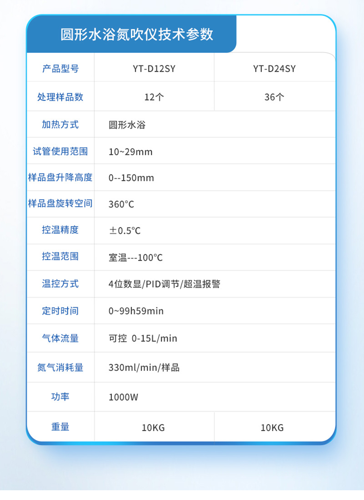 | YT-D12SY | 12個獨立控制 | 圓形水浴 | 10~29mm | 0--150mm | 360°C | ±0.5℃ | 室溫---100℃ | 4位數(shù)顯/PID調(diào)節(jié)/超溫報警 | 0~99h59min | 可控 0-15L/min | 330ml/min/樣品 | 1000W | 10KG |
