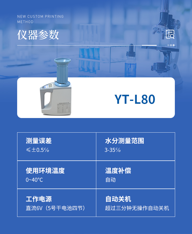 產(chǎn)品介紹: TY-L80型糧食水分測(cè)定儀是老型糧食水分測(cè)定儀的升級(jí)產(chǎn)品、在原來(lái)的基礎(chǔ)上增加了自動(dòng)累加測(cè)量次數(shù),計(jì)算平均值功能和容量自動(dòng)換算顯示功能,其性能更穩(wěn)定可靠,擁有外觀設(shè)計(jì)國(guó)家**,外形新穎美觀,完**與國(guó)外同類產(chǎn)品媲美,是水分測(cè)量?jī)x器理想的升級(jí)換代產(chǎn)品。 容重?fù)Q算:獨(dú)特的專