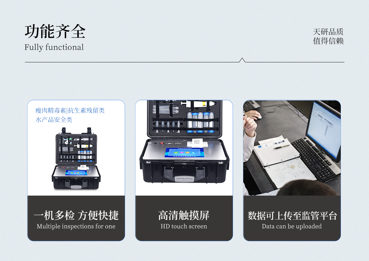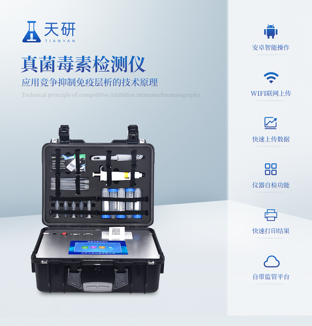 | 用途:可用于糧食谷物及其制品、飼料、植物油中真菌毒素快速定量測定; | 檢測方法:采用發(fā)光定量免疫層析技術(shù),激光激發(fā),掃描方式收集發(fā)光熒光信號。 | 定量參數(shù)設(shè)定:RFID芯片記錄檢測目標(biāo)的標(biāo)準(zhǔn)曲線,根據(jù)不同樣本類型配備多參數(shù)卡; | 識別功能:試劑插卡后儀器自動識別檢測項(xiàng)目; | 靈敏性和特異性:不受外界的背景干擾, 檢測限為0.4-4500ug/kg;對其它毒素?zé)o非特異反應(yīng); | 穩(wěn)定性:無淬滅和光漂白現(xiàn)象; | 檢測時(shí)間快,實(shí)時(shí)顯示檢測曲線 | 無需孵育器,室溫(15-30℃)下進(jìn)行測試 | 數(shù)據(jù)獲取和處理:檢測結(jié)果自動獲取(無需目測),可實(shí)時(shí)打印檢測報(bào)告;數(shù)據(jù)可儲存,可導(dǎo)出。 | 儀器可靠:有開機(jī)系統(tǒng)自檢功能;儀器配有質(zhì)控卡,確保檢測系統(tǒng)自身的準(zhǔn)確性; | 檢測數(shù)據(jù)精準(zhǔn)可靠:HPLC/LC-MS結(jié)果接近 | 檢測儀器獲得國家認(rèn)證 | 聯(lián)網(wǎng):網(wǎng)絡(luò)接口 | 升級:可以通過U盤進(jìn)行軟件升級 | 存儲空間:≥32G,**擴(kuò)展至64G | 工作功率:40W | 操作系統(tǒng):windows 7 | 顯示屏:可觸摸顯示屏,屏幕尺寸≥8寸 | 定量檢測項(xiàng)目:包括黃曲霉毒素B1、嘔吐毒素、玉米赤霉烯酮、T-2毒素、伏馬毒素 |