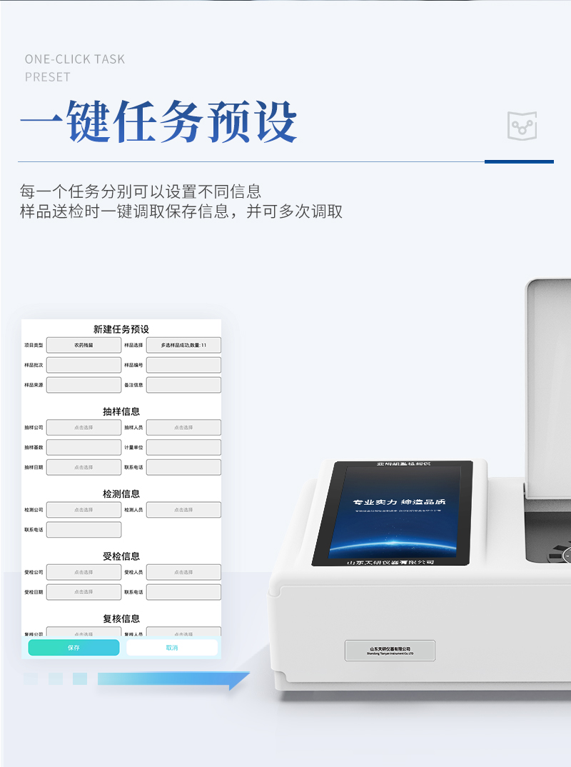 | 儀器采用臺(tái)式一體化系統(tǒng)檢測(cè)技術(shù),將分光光度模塊、數(shù)字化管理模塊、無(wú)線(xiàn)通訊模塊高度集成于一體,可支持檢測(cè)60種食品安全檢測(cè)項(xiàng)目,同時(shí)預(yù)留升級(jí)檢測(cè)方法。 | 儀器檢測(cè)模塊標(biāo)準(zhǔn)化、智能化,檢測(cè)項(xiàng)目可隨意自由組合。檢測(cè)箱體內(nèi)置多個(gè)標(biāo)準(zhǔn)檢測(cè)單元,檢測(cè)模塊可以調(diào)整配置。 | 顯示屏幕:儀器采用10.1英寸豎向液晶觸摸屏顯,搭配運(yùn)行安卓智能操作系統(tǒng),主控芯片采用ARM Cortex-A7,RK3288/4核處理器,主頻1.88Ghz,操作方便,性能更強(qiáng)。 | 檢測(cè)通道:≥12通道;采用精密旋轉(zhuǎn)比色池設(shè)計(jì),使用同芯片同光源校準(zhǔn)精度,解決不同光源之間的誤差值,更加準(zhǔn)確**。(1-12通道間誤差0.1%,**號(hào):ZL202022821055.2) | 儀器光源:高精度進(jìn)口四波長(zhǎng)冷光源,每個(gè)通道均配置 410、520、590、630nm 波長(zhǎng)光源,標(biāo)配**的光路切換裝置,**光路切換功能可實(shí)現(xiàn)64波長(zhǎng),并且所有檢測(cè)項(xiàng)目可實(shí)現(xiàn)所有通道同時(shí)檢測(cè)。 | 設(shè)備可一鍵校準(zhǔn),自動(dòng)保存校準(zhǔn)數(shù)據(jù),自動(dòng)對(duì)比校驗(yàn),得到精準(zhǔn)光源,采用Android SP存儲(chǔ)數(shù)據(jù),光源數(shù)據(jù)永不丟失,方便每一次使用。 | 通訊接口:配備無(wú)線(xiàn)通信模塊、4G(APN)通訊模塊、藍(lán)牙傳輸,同時(shí)具有雙USB接口以及RJ45網(wǎng)線(xiàn)接口,可以多方式實(shí)現(xiàn)數(shù)據(jù)保存及數(shù)據(jù)傳輸。 | 存儲(chǔ)方式:支持U盤(pán)存儲(chǔ),標(biāo)準(zhǔn)USB接口,免驅(qū)動(dòng)安裝。檢測(cè)結(jié)果存儲(chǔ)容量20萬(wàn)條以上,可生成Excel表格進(jìn)行拷貝,并具有登錄保護(hù)功能。 | 智能化操作系統(tǒng): | 1、操作系統(tǒng):儀器可在同一檢測(cè)界面自動(dòng)對(duì)應(yīng)相關(guān)檢測(cè)通道,一次性選擇1-12個(gè)樣品名稱(chēng),無(wú)需退出界面,節(jié)省操作時(shí)間。并可以對(duì)每個(gè)通道屬性和樣品信息單獨(dú)進(jìn)行編輯,例如送檢單位、人員,檢測(cè)人員等,打印時(shí)勾選打印顯示。 | 2、數(shù)據(jù)集成系統(tǒng):設(shè)備首頁(yè)自動(dòng)匯總分析檢測(cè)數(shù)據(jù),包含:周檢測(cè)數(shù)據(jù)、月檢測(cè)數(shù)據(jù),全部檢測(cè)總數(shù)量,均包含檢測(cè)總數(shù),合格數(shù),不合格數(shù),以及相關(guān)柱形分析圖,各項(xiàng)檢測(cè)數(shù)據(jù)一目了然,無(wú)需電腦查詢(xún),更加快捷直觀(guān)。 | 3、數(shù)據(jù)庫(kù)系統(tǒng):十幾項(xiàng)數(shù)據(jù)庫(kù)分類(lèi)管理儀器:包含項(xiàng)目類(lèi)型、項(xiàng)目數(shù)據(jù)、檢測(cè)數(shù)據(jù)、歷史記錄、國(guó)標(biāo)信息、曲線(xiàn)信息、采樣信息、檢測(cè)信息、受檢信息、復(fù)核信息、圖表信息、光源校準(zhǔn)信息、打印樣式信息、樣品庫(kù)信息等等,數(shù)據(jù)庫(kù)之間互相協(xié)調(diào)聯(lián)動(dòng)保證數(shù)據(jù)的真實(shí)完整性。同時(shí)產(chǎn)品數(shù)據(jù)庫(kù)以及歷史檢測(cè)記錄支持一鍵檢索功能。 | 4、限量規(guī)判系統(tǒng):具有限量查詢(xún)、添加物質(zhì)合規(guī)判定系統(tǒng)。檢測(cè)出結(jié)果后,系統(tǒng)自動(dòng)調(diào)用系統(tǒng)數(shù)據(jù)庫(kù)中相關(guān)國(guó)標(biāo)進(jìn)行比對(duì)判定,客觀(guān)顯示判定結(jié)果是否合格。 | 5、項(xiàng)目預(yù)設(shè)系統(tǒng):儀器具有任務(wù)預(yù)設(shè)模塊,一鍵提前預(yù)設(shè),給出方便快捷的新檢測(cè)方案,每一個(gè)任務(wù)分別可以設(shè)置不同的樣品、批次、編號(hào)、來(lái)源、備注、抽樣信息、檢測(cè)信息、受檢信息、復(fù)核信息等更多信息。樣品送檢時(shí)一鍵調(diào)取保存信息,并可多次調(diào)取,大大提高檢測(cè)效率。 | 6、數(shù)據(jù)監(jiān)管系統(tǒng):同步對(duì)接監(jiān)管平臺(tái),數(shù)據(jù)可局域網(wǎng)和互聯(lián)網(wǎng)數(shù)據(jù)上傳,檢測(cè)結(jié)果可選擇直接傳至食品安全監(jiān)管平臺(tái)。進(jìn)行區(qū)域食品安全監(jiān)管及大數(shù)據(jù)分析處理與數(shù)據(jù)統(tǒng)計(jì),檢測(cè)區(qū)域食品安全長(zhǎng)短期動(dòng)態(tài),達(dá)到食品安全問(wèn)題預(yù)估、預(yù)警。 | 7.1、全新打印系統(tǒng):內(nèi)置全新打印機(jī),新創(chuàng)自定義打印方式,可按需靈活勾選控制:二維碼,抽樣信息、檢測(cè)信息,受檢信息、復(fù)核信息、抽樣日期、檢測(cè)日期等信息的打印。 | 7.2、A4紙版本報(bào)告打印功能(可選配):設(shè)備擁有兩種結(jié)果展示方式,可以自動(dòng)生成A4打印模板和小票打印模板兩種樣式,可通過(guò)WiFi及網(wǎng)線(xiàn)等方式鏈接外置打印機(jī)可進(jìn)行打印。 | 8.供電模式:儀器交直流兩用,直流12V供電,可連接車(chē)載電源,可配6ah大容量充電鋰電池,電量可實(shí)時(shí)顯示,方便戶(hù)外流動(dòng)測(cè)試。 | 9.儀器具備遠(yuǎn)程升級(jí)功能,可定向分客戶(hù)分儀器更新,開(kāi)機(jī)后自動(dòng)更新,并可持續(xù)性免費(fèi)更新系統(tǒng)版本,無(wú)需像傳統(tǒng)產(chǎn)品返廠(chǎng)更新,節(jié)省時(shí)間及人力成本并避免