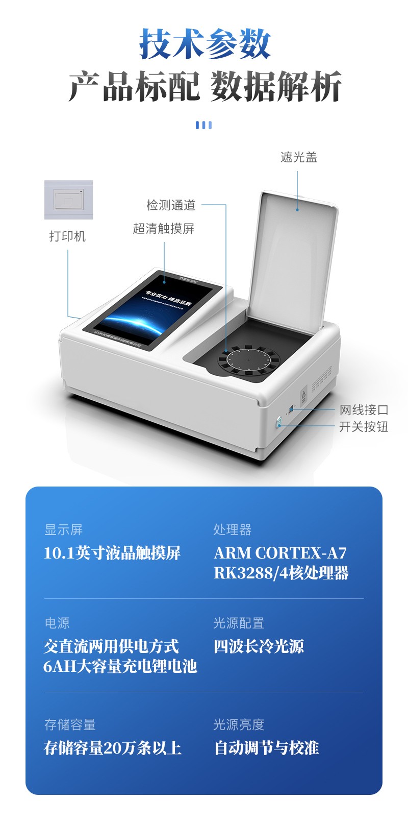 | 儀器采用臺式一體化系統(tǒng)檢測技術(shù),將分光光度模塊、新型農(nóng)殘檢測模塊、數(shù)字化管理模塊、無線通訊模塊高度集成于一體,支持檢測200種食品安全檢測項目,同時預(yù)留升級檢測方法。 | 儀器檢測模塊標(biāo)準(zhǔn)化、智能化,可隨意自由組合。檢測箱體內(nèi)置多個標(biāo)準(zhǔn)檢測單元,檢測模塊可以調(diào)整配置。 | 儀器采用全新安卓智能系統(tǒng),主控芯片采用 ARM Cortex-A7,RK3288/4核處理器,10.1寸高清液晶觸摸豎屏,更加**的UI交互界面,運轉(zhuǎn)快捷;儀器配備無線通信模塊: 4G(APN)通訊模塊、Wifi模塊,藍牙傳輸,同時具有雙USB接口以及RJ45接口能以多種方式實現(xiàn)數(shù)據(jù)保存和數(shù)據(jù)傳輸功能。 | 創(chuàng)新檢測模式: | ★檢測通道:≥12通道;采用精密旋轉(zhuǎn)比色池設(shè)計,使用同芯片同光源校準(zhǔn)精度,解決不同光源之間的誤差值。1-12通道間誤差0.1%。(**號:ZL202022821055.2) | ★儀器具有自動識別比色皿檢測功能,即:將樣品比色皿放入儀器后,點擊樣品檢測,儀器自動識別比色皿進行通道檢測。 | 進口高精光源: | 高精度進口四波長冷光源,通道配置 410、520、590、630nm 波長光源,一個光源芯片驅(qū)動一個光源,誤差極小,每臺設(shè)備單獨**校準(zhǔn)光源,**比對,同時參照四種不同波段光源全方位覆蓋市面上99%的農(nóng)殘食品項目檢測。 | 智能化操作系統(tǒng): | 便捷操作系統(tǒng):設(shè)備檢測時可在同一檢測界面自動對應(yīng)相關(guān)檢測通道一次性選擇1-12個樣品名稱,無須退出界面,節(jié)省操作時間。 | 數(shù)據(jù)集成系統(tǒng):設(shè)備首頁自動統(tǒng)計檢測數(shù)據(jù)包含:周檢測數(shù)據(jù)、月檢測數(shù)據(jù),全部檢測總數(shù)量,均包含檢測總數(shù),合格數(shù),不合格數(shù),以及相關(guān)柱形分析圖,對各項檢測數(shù)據(jù)清晰掌握,無需電腦查詢,更加快捷直觀。 | 項目預(yù)設(shè)系統(tǒng):支持添加單個及多個相同或不相同的任務(wù)預(yù)設(shè),一鍵快速調(diào)取,每一個任務(wù)分別可以設(shè)置不同的樣品、批次、編號、來源、備注、抽樣信息、檢測信息、受檢信息、復(fù)核信息等更多信息。無縫鏈接平臺和APP實時查看下發(fā)任務(wù)。 | 數(shù)據(jù)監(jiān)管系統(tǒng):同步對接監(jiān)管平臺,數(shù)據(jù)可局域網(wǎng)和互聯(lián)網(wǎng)數(shù)據(jù)上傳,檢測結(jié)果可選擇直接傳至食品安全監(jiān)管平臺。集成OSS輸出存儲服務(wù)、區(qū)分設(shè)備定向管理應(yīng)用,進行區(qū)域食品安全監(jiān)管及大數(shù)據(jù)分析處理與數(shù)據(jù)統(tǒng)計,檢測區(qū)域食品安全長短期動態(tài),達到食品安全問題預(yù)估、預(yù)警。 | 自定義打印系統(tǒng):內(nèi)置全新打印系統(tǒng),新創(chuàng)自定義打印方式,可按需靈活設(shè)置開啟或關(guān)閉:產(chǎn)品合格證(國家農(nóng)業(yè)部標(biāo)準(zhǔn)要求),二維碼,抽樣信息、檢測信息,受檢信息、復(fù)核信息、抽樣日期、檢測日期等信息的打印。 | 系統(tǒng)遠程更新功能:可定向分客戶分儀器更新系統(tǒng),按照不同客戶后期實際需求添加項目,無需機器返廠,即可遠程實時升級全新系統(tǒng),節(jié)省時間成本及避免運輸造成設(shè)備損壞。 | 儀器主機采用一體化防水、抗壓、防撞擊、防腐蝕箱體設(shè)計,同時配備交直流供電,可連接車載電源,可選配大容量充電鋰電池,滿足現(xiàn)場野外檢測需求。 | 安全證書,放心保障:儀器具有中國計量科學(xué)研究院校準(zhǔn)證書,**認(rèn)證。 |