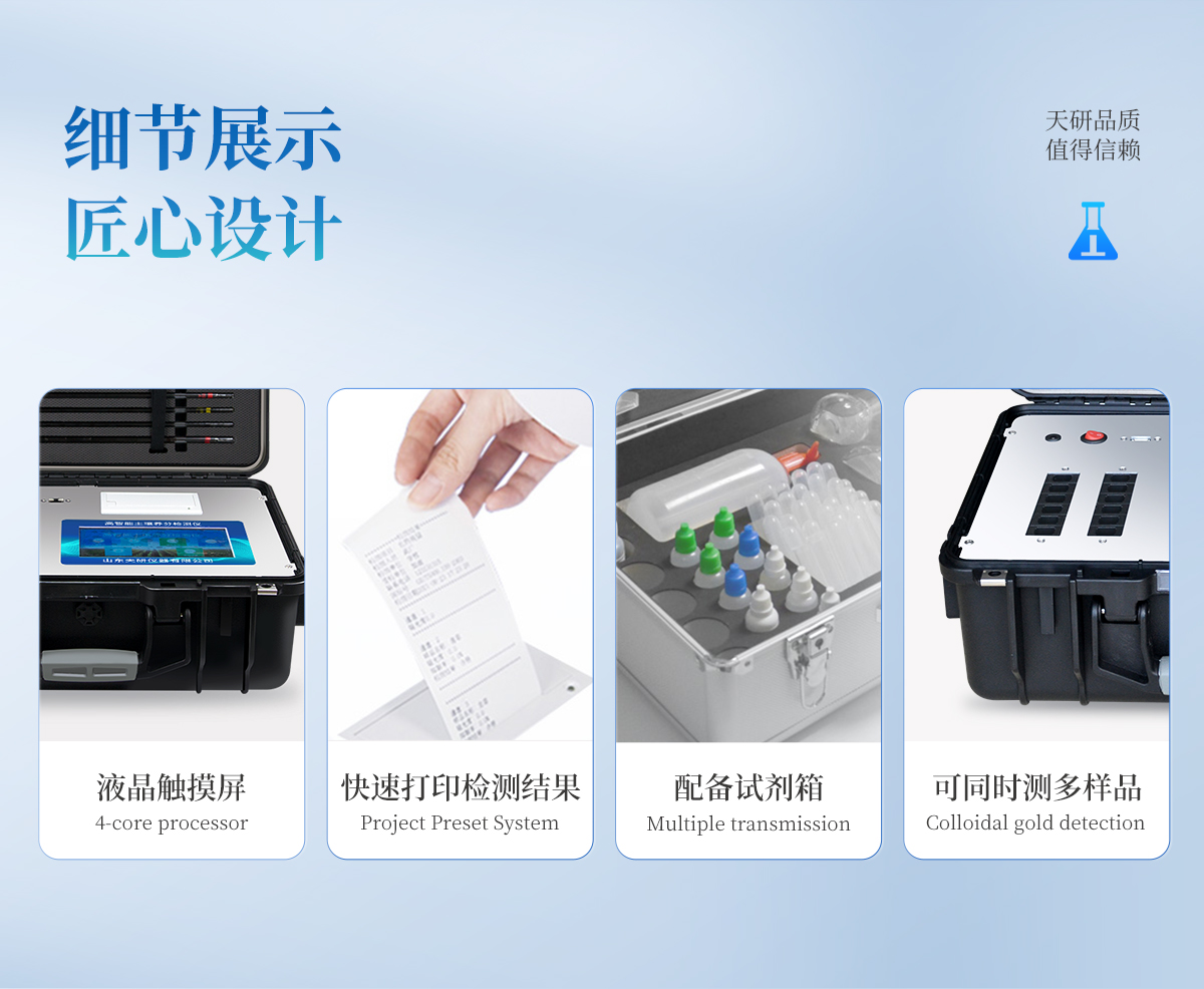 | 配套齊全:該儀器集藥、器、儀為一體,攜帶方便,相當(dāng)于一個(gè)小型移動(dòng)實(shí)驗(yàn)室,無需用戶自配附件,亦可靈活野外流動(dòng)測(cè)試。適于農(nóng)業(yè)服務(wù)部門或農(nóng)資經(jīng)銷商、合作社、肥料廠商、大種植戶測(cè)土施肥。 | 檢測(cè)功能全:測(cè)試項(xiàng)目國(guó)內(nèi)外全面,除標(biāo)配試劑外,其他各類藥劑均可加配選購(gòu)。 | 操作簡(jiǎn)便、速度快捷,配套整套附件及成品藥劑開瓶即用,無須配置。 |