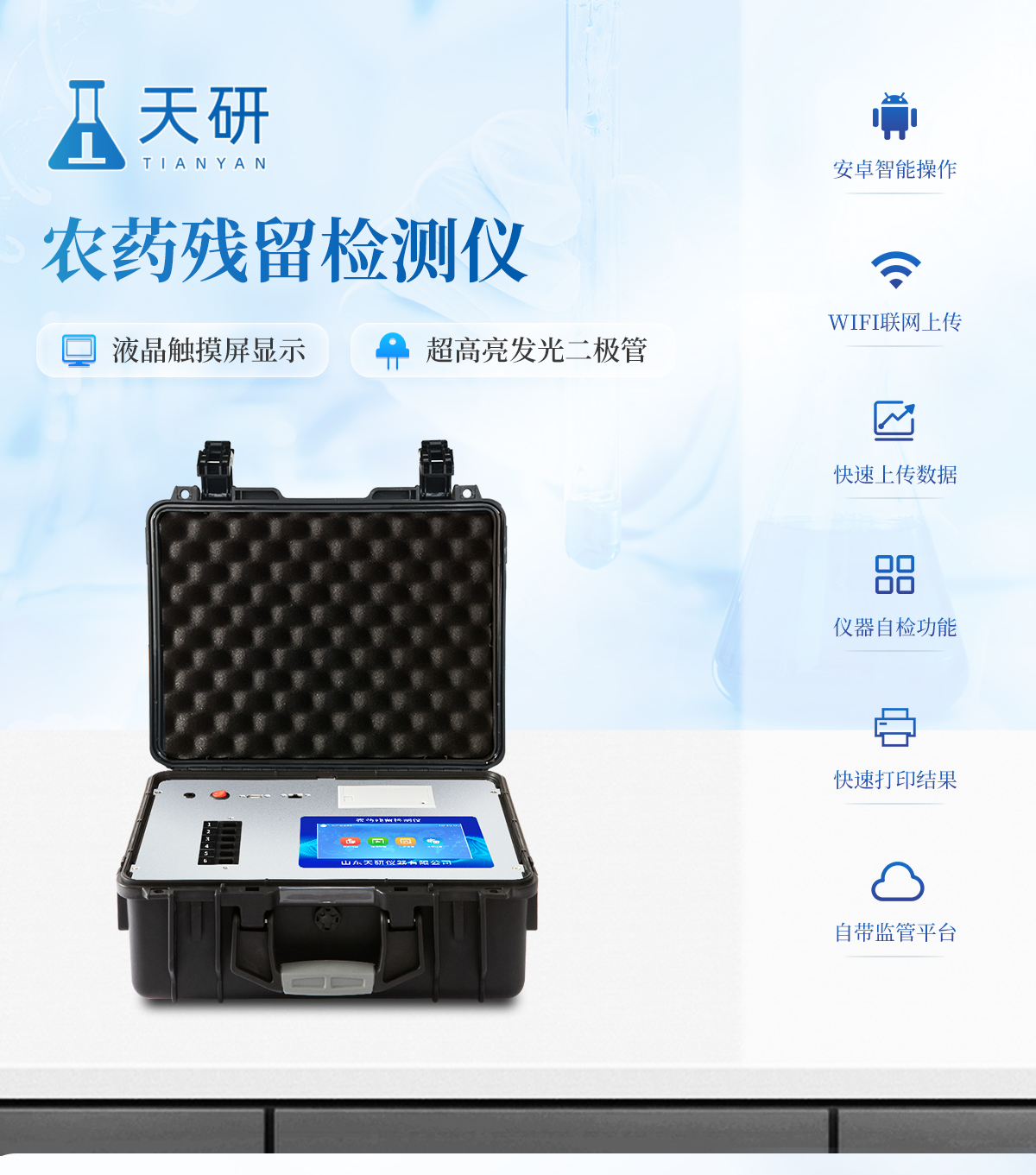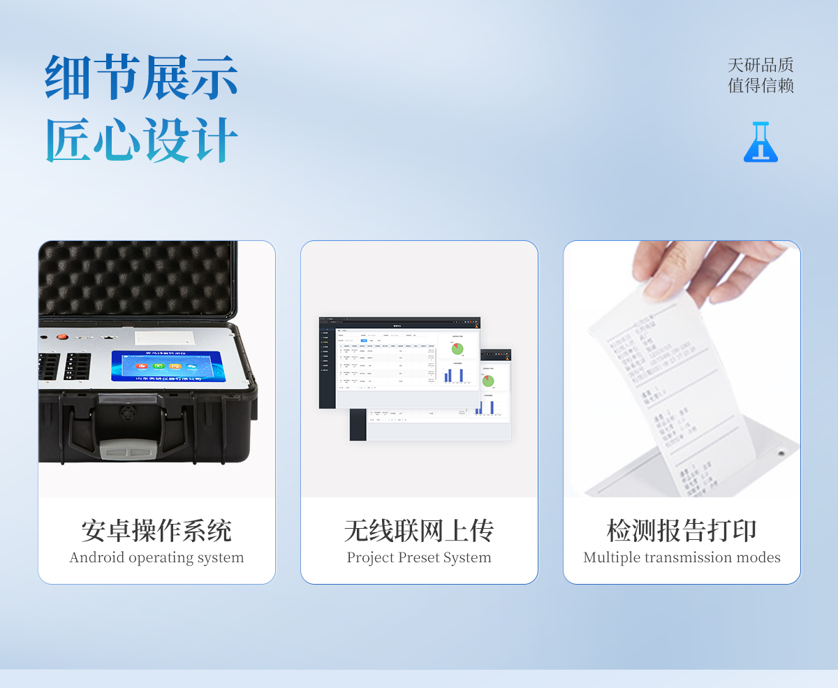 | 機箱采用工業(yè)級ABS工程塑料箱,方便攜帶,穩(wěn)固耐用,便于流動測試。 | 智能操作系統(tǒng),采用更加人性化操作,主控采用多核處理器,主頻1.88Ghz,運轉(zhuǎn)速度更快速,穩(wěn)定性更強。 | 自動判斷樣品是否合格,檢測結(jié)果更加直觀。 | 儀器具有100多種蔬菜名稱菜單庫,分類管理,并可按需添加或刪除蔬菜名,編輯蔬菜名稱,可直接打印出蔬菜名稱。 | 檢測通道:6個檢測通道,可以同時測試多個樣品,循環(huán)檢測,即放即檢,每個樣品由程序控制分別獨立工作,不會互相干擾。 | 儀器具有wifi聯(lián)網(wǎng)功能,可將數(shù)據(jù)快速上傳電腦,進行數(shù)據(jù)管理與統(tǒng)計,4G信號GPRS遠傳功能,可插手機卡實現(xiàn)數(shù)據(jù)遠傳平臺,。 | 顯示方式:7英寸高靈敏真彩觸摸屏顯示,人性化中文操作界面,讀數(shù)直觀、簡單。 | 打印機采用串口5v打印,可選擇手動打印或者自動打印,三分鐘出打印結(jié)果,打印格式為檢測人姓名、吸光度差值、檢測時間、檢測機構(gòu)、樣品名稱及結(jié)果判定。 | 光源采用進口超高亮發(fā)光二極管,具有低功耗、高精度、穩(wěn)定性強、光源可控可以關(guān)掉不使用的光源,響應(yīng)速度快等優(yōu)點。 | 智能恒流穩(wěn)壓,光強自動校準,長時間連續(xù)工作光源無溫漂現(xiàn)象。 | 采用USB2.0接口設(shè)計,方便數(shù)據(jù)的存貯和移動,并可隨時與計算機直接相連,并且可用計算機控制儀器。實現(xiàn)數(shù)據(jù)查詢、瀏覽、分析、統(tǒng)計、打印等。 | 智能化程度高,儀器具有自檢功能:具有開機自檢和調(diào)零功能,具有自動檢測重復性功能 | 儀器具有自身保護功能,可設(shè)置用戶名及密碼,防止非工作人員操作等。 | 采用DC12v直流供電,安全系統(tǒng)更高,并且配備6A鋰電池充電器。 | 儀器具有重新校準、鎖定、恢復出廠設(shè)置功能。 |