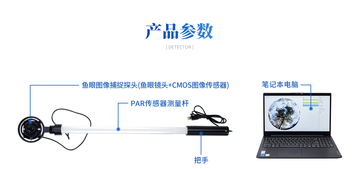 植物冠層圖像分析儀由魚眼圖像捕捉探頭(由魚眼鏡頭及CCD圖像傳感器組成)、內(nèi)置25個(gè)PAR傳感器的測量桿(搖臂)、筆記本電腦、圖像采集軟件及圖像 分析軟件、高容量的可充電電池組組成。魚眼探頭安裝在一個(gè)很輕的搖臂的頂端,它可以獲取150°視角的魚眼圖像。圖像的顯示和存貯由配置的筆記本計(jì)算機(jī)完 成。