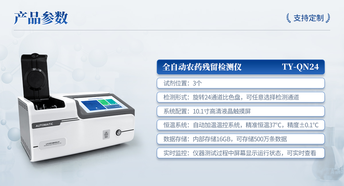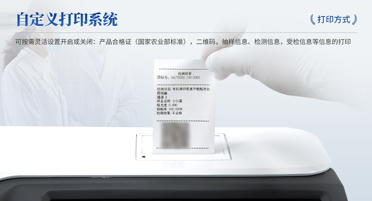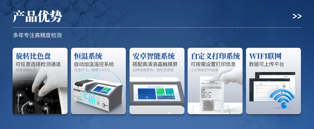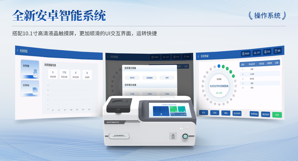 | 1. 試劑位置:3個(gè) | 2. 檢測形式:旋轉(zhuǎn)24通道比色盤,可任意選擇檢測通道,自動對應(yīng)選擇通道。 | 3. 系統(tǒng)配置:10.1寸高清液晶觸摸屏,采用ARM Cortex?-A7,RK3288/4核處理器,運(yùn)行內(nèi)存1GB。Android7.1.1 系統(tǒng)分辨率1280×800。 | 4.恒溫系統(tǒng):具有自動加溫溫控系統(tǒng),精準(zhǔn)恒溫37℃,精度±0.1℃。 | 5.添加系統(tǒng):儀器按照試劑要求自動、按時(shí)、按量加入試劑,并且自動對未正常放置的樣本或異常的樣本進(jìn)行檢查并提示。 | 6.清洗功能:儀器具備回流及自動清洗管路功能,避免試劑污染。 | 7.混勻功能:設(shè)備具備自動混勻功能。 | 8.光源校準(zhǔn):設(shè)備可自動校準(zhǔn),確保檢測準(zhǔn)確度。 | 9.實(shí)時(shí)監(jiān)控:儀器測試過程中屏幕顯示運(yùn)行狀態(tài),可實(shí)時(shí)查看。 | 10.數(shù)據(jù)存儲:內(nèi)部存儲16GB,可存儲500萬條數(shù)據(jù)。 | 11.樣品多選功能:設(shè)備具備樣品一鍵多選功能,選擇樣品自動匹配檢測通道。 | 12.項(xiàng)目預(yù)設(shè):可提前設(shè)置單個(gè)及多個(gè)相同或不相同的檢測任務(wù),可單次或者多次調(diào)取,減少檢測時(shí)間。 | 13.自定義打印系統(tǒng):內(nèi)置自定義打印系統(tǒng),可按需靈活設(shè)置開啟或關(guān)閉:產(chǎn)品合格證(國家農(nóng)業(yè)部標(biāo)準(zhǔn)),二維碼,抽樣信息、檢測信息,受檢信息等信息的打印。 | 14.A4版本報(bào)告打印功能:設(shè)備可自動生成A4版報(bào)告,A4報(bào)告帶二維碼,可掃描二維碼生成電子版,并可識別真?zhèn)巍?/td> | 15.傳輸方式:儀器配備無線通信模塊: 4G(APN)通訊模塊、Wifi模塊,藍(lán)牙傳輸模塊,同時(shí)具有USB接口以及RJ45接口能以多種方式實(shí)現(xiàn)數(shù)據(jù)保存和數(shù)據(jù)傳輸功能,設(shè)備數(shù)據(jù)可以同步上傳至平臺。 | 16.數(shù)據(jù)監(jiān)管系統(tǒng):設(shè)備自帶監(jiān)管平臺,并可同步對接監(jiān)管平臺,數(shù)據(jù)可局域網(wǎng)和互聯(lián)網(wǎng)數(shù)據(jù)上傳,檢測結(jié)果可直接傳至食品安全監(jiān)管平臺。達(dá)到食品安全問題預(yù)估、預(yù)警。 | 17.系統(tǒng)遠(yuǎn)程更新功能:無需設(shè)備返廠,即可遠(yuǎn)程實(shí)時(shí)升級全新系統(tǒng),節(jié)省時(shí)間成本及避免運(yùn)輸造成設(shè)備損。 |