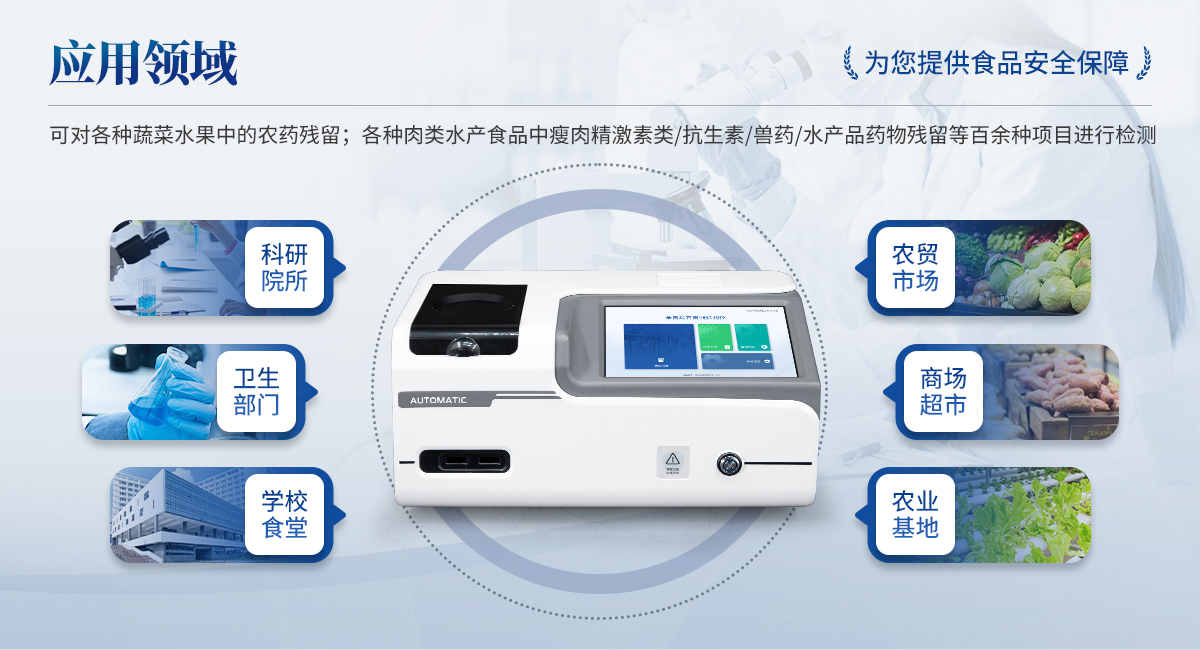 全自動農(nóng)獸藥殘留檢測儀可對各種蔬菜水果中有機(jī)磷和氨基甲酸酯類農(nóng)藥殘留;各種肉類水產(chǎn)食品中瘦肉精激素類殘留,抗生素殘留,獸藥殘留,水產(chǎn)品藥物殘留等百余種項(xiàng)目進(jìn)行快速檢測。該設(shè)備廣泛應(yīng)用于蔬菜批發(fā)市場、超市、商場、食藥監(jiān)等部門的蔬菜和水果中的農(nóng)藥殘留檢測。