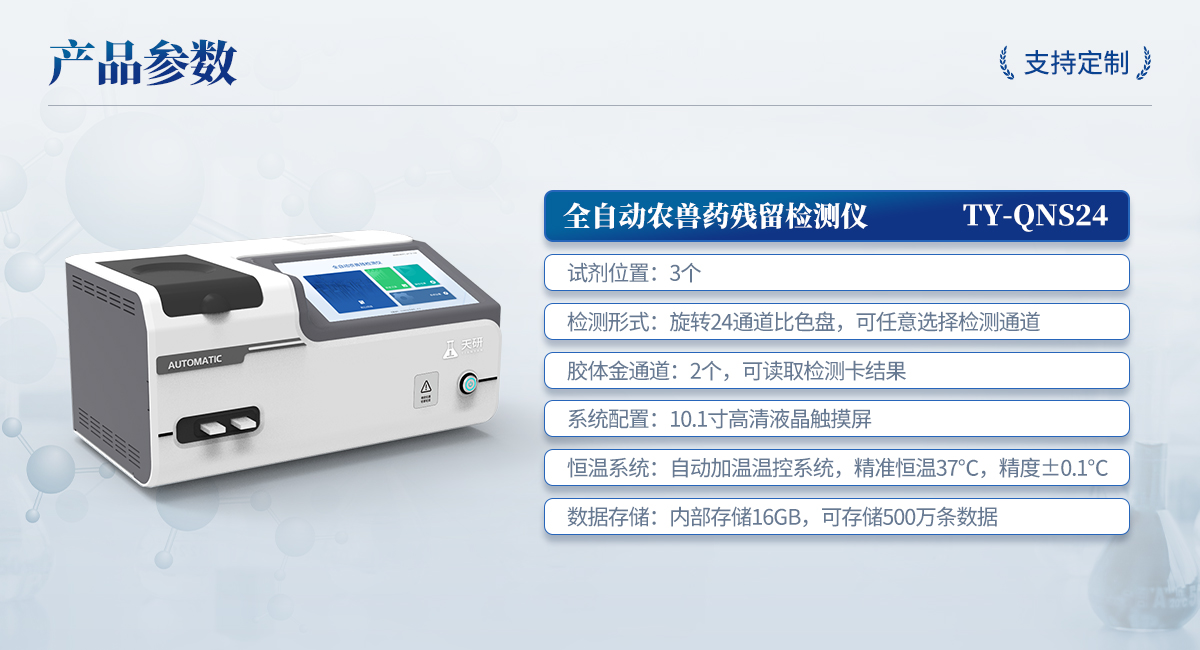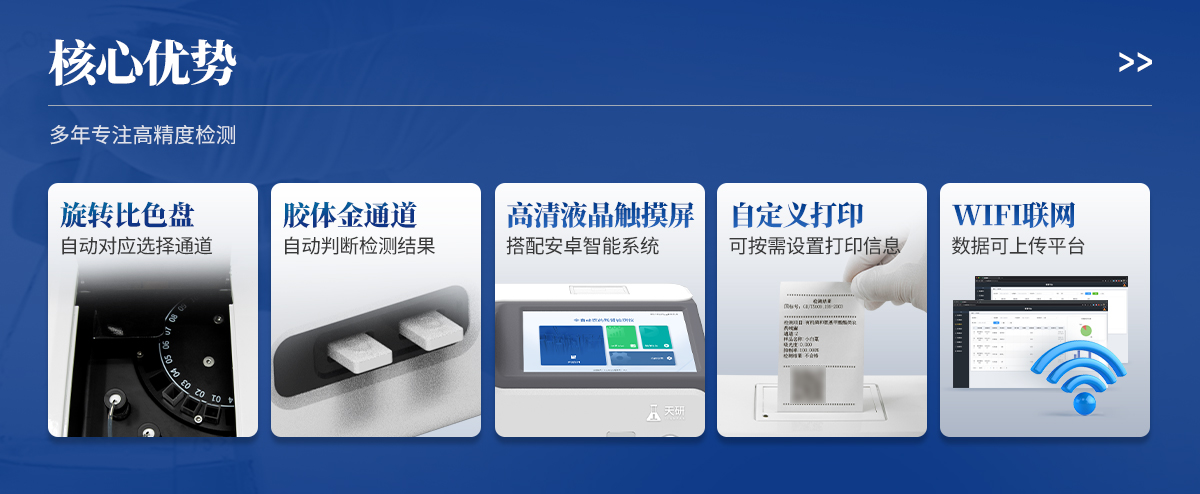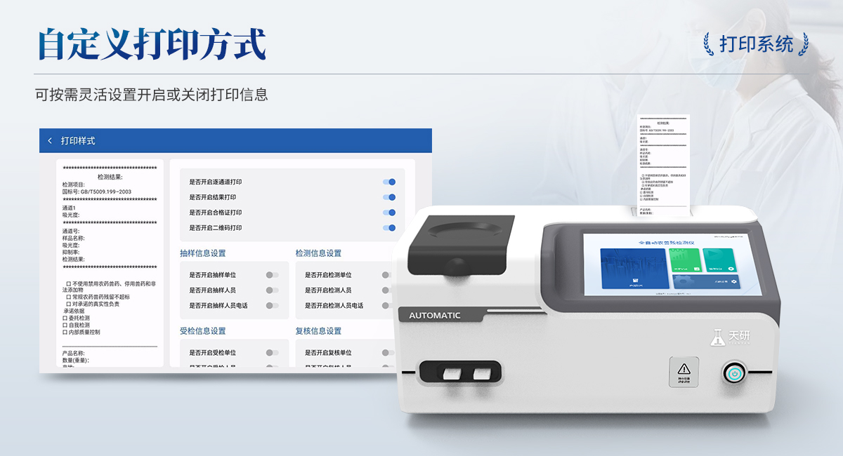 | 1. 試劑位置:3個 | 2. 農(nóng)殘檢測盤:旋轉(zhuǎn)24通道比色盤,可任意選擇檢測通道,自動對應(yīng)選擇通道。 | 3. 膠體金通道:2個,可讀取檢測卡結(jié)果,自動采集、處理分析,自動判斷檢測結(jié)果,并具備自動判空功能。 | 4.系統(tǒng)配置:10.1寸高清液晶觸摸屏,采用ARM Cortex?-A7,RK3288/4核處理器,運(yùn)行內(nèi)存1GB。Android7.1.1 系統(tǒng)分辨率1280×800。 | 5.恒溫系統(tǒng):具有自動加溫溫控系統(tǒng),精準(zhǔn)恒溫37℃,精度±0.1℃。 | 6.添加系統(tǒng):儀器按照試劑要求自動、按時、按量加入試劑,并且自動對未正常放置的樣本或異常的樣本進(jìn)行檢查并提示。 | 7.清洗功能:儀器具備回流及自動清洗管路功能,避免試劑污染。 | 8.混勻功能:設(shè)備具備自動混勻功能。 | 9.光源校準(zhǔn):設(shè)備可自動校準(zhǔn),確保檢測準(zhǔn)確度。 | 10.實(shí)時監(jiān)控:儀器測試過程中屏幕顯示運(yùn)行狀態(tài),可實(shí)時查看。 | 11.數(shù)據(jù)存儲:內(nèi)部存儲16GB,可存儲500萬條數(shù)據(jù)。 | 12.樣品多選功能:設(shè)備具備樣品一鍵多選功能,選擇樣品自動匹配檢測通道。 | 13.項(xiàng)目預(yù)設(shè):可提前設(shè)置單個及多個相同或不相同的檢測任務(wù),可單次或者多次調(diào)取,減少檢測時間。 | 14.自定義打印系統(tǒng):內(nèi)置自定義打印系統(tǒng),可按需靈活設(shè)置開啟或關(guān)閉:產(chǎn)品合格證(國家農(nóng)業(yè)部標(biāo)準(zhǔn)),二維碼,抽樣信息、檢測信息,受檢信息等信息的打印。 | 15.A4版本報告打印功能:設(shè)備可自動生成A4版報告,A4報告帶二維碼,可掃描二維碼生成電子版,并可識別真?zhèn)巍?/td> | 16.傳輸方式:儀器配備無線通信模塊: 4G(APN)通訊模塊、Wifi模塊,藍(lán)牙傳輸模塊,同時具有USB接口以及RJ45接口能以多種方式實(shí)現(xiàn)數(shù)據(jù)保存和數(shù)據(jù)傳輸功能,設(shè)備數(shù)據(jù)可以同步上傳至平臺。 | 17.系統(tǒng)17.數(shù)據(jù)監(jiān)管系統(tǒng):設(shè)備自帶監(jiān)管平臺,并可同步對接監(jiān)管平臺,數(shù)據(jù)可局域網(wǎng)和互聯(lián)網(wǎng)數(shù)據(jù)上傳,檢測結(jié)果可直接傳至食品安全監(jiān)管平臺。達(dá)到食品安全問題預(yù)估、預(yù)警。 | 18.系統(tǒng)遠(yuǎn)程更新功能:無需設(shè)備返廠,即可遠(yuǎn)程實(shí)時升級全新系統(tǒng),節(jié)省時間成本及避免運(yùn)輸造成設(shè)備損。 |