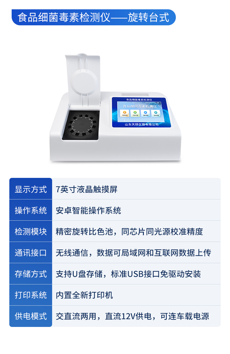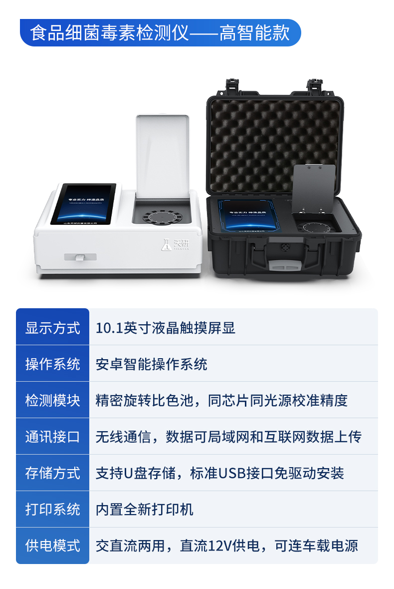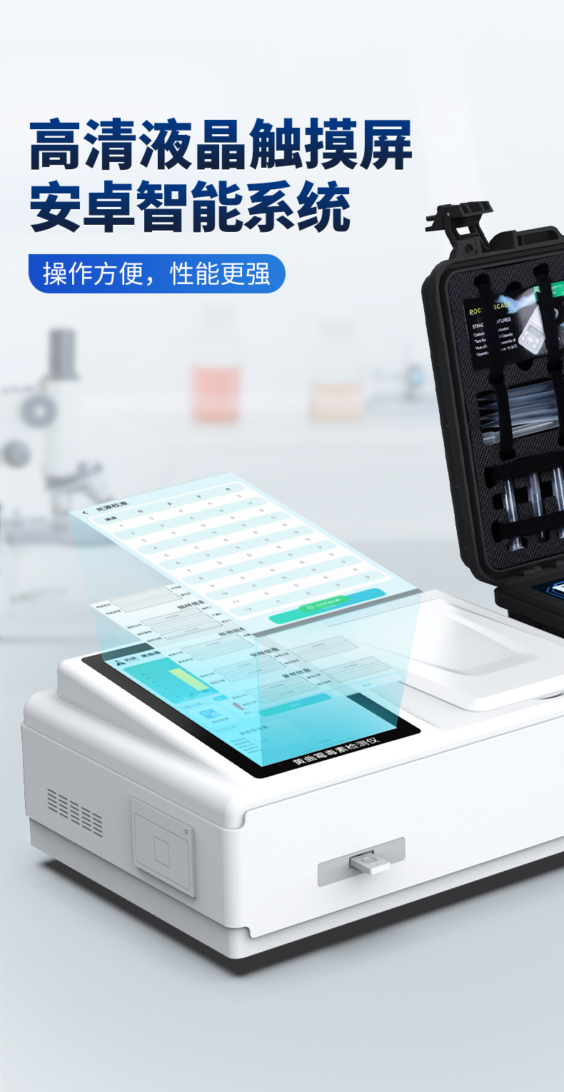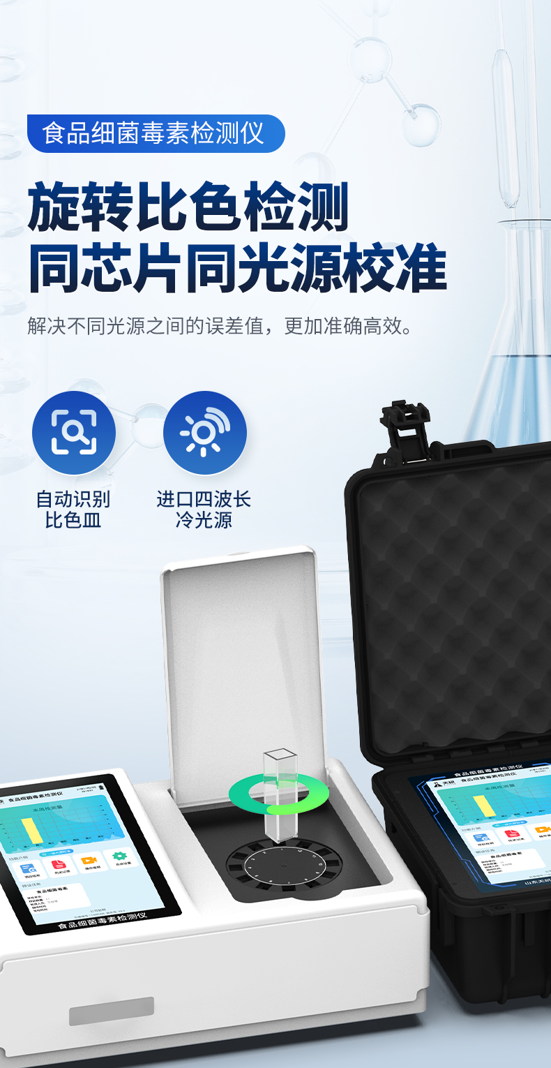 | 儀器采用手提一體化系統(tǒng)檢測(cè)技術(shù),將分光光度模塊、數(shù)字化管理模塊、無(wú)線通訊模塊高度集成于一體,可支持檢測(cè)60種食品安全檢測(cè)項(xiàng)目,同時(shí)預(yù)留升級(jí)檢測(cè)方法。 | 儀器檢測(cè)模塊標(biāo)準(zhǔn)化、智能化,檢測(cè)項(xiàng)目可隨意自由組合。檢測(cè)箱體內(nèi)置多個(gè)標(biāo)準(zhǔn)檢測(cè)單元,檢測(cè)模塊可以調(diào)整配置。 | 顯示屏幕:儀器采用10.1英寸豎向液晶觸摸屏顯,搭配運(yùn)行安卓智能操作系統(tǒng),主控芯片采用ARM Cortex-A7,RK3288/4核處理器,主頻1.88Ghz,操作方便,性能更強(qiáng)。 | 檢測(cè)通道:≥12通道;采用精密旋轉(zhuǎn)比色池設(shè)計(jì),使用同芯片同光源校準(zhǔn)精度,解決不同光源之間的誤差值,更加準(zhǔn)確**。(1-12通道間誤差0.1%,**號(hào):ZL202022821055.2) | 儀器光源:高精度進(jìn)口四波長(zhǎng)冷光源,每個(gè)通道均配置 410、520、590、630nm 波長(zhǎng)光源,標(biāo)配**的光路切換裝置,**光路切換功能可實(shí)現(xiàn)64波長(zhǎng),并且所有檢測(cè)項(xiàng)目可實(shí)現(xiàn)所有通道同時(shí)檢測(cè)。 | 設(shè)備可一鍵校準(zhǔn),自動(dòng)保存校準(zhǔn)數(shù)據(jù),自動(dòng)對(duì)比校驗(yàn),得到精準(zhǔn)光源,采用Android SP存儲(chǔ)數(shù)據(jù),光源數(shù)據(jù)永不丟失,方便每一次使用。 | 通訊接口:配備無(wú)線通信模塊、4G(APN)通訊模塊、藍(lán)牙傳輸,同時(shí)具有雙USB接口以及RJ45網(wǎng)線接口,可以多方式實(shí)現(xiàn)數(shù)據(jù)保存及數(shù)據(jù)傳輸。 | 存儲(chǔ)方式:支持U盤(pán)存儲(chǔ),標(biāo)準(zhǔn)USB接口,免驅(qū)動(dòng)安裝。檢測(cè)結(jié)果存儲(chǔ)容量20萬(wàn)條以上,可生成Excel表格進(jìn)行拷貝,并具有登錄保護(hù)功能。 | 智能化操作系統(tǒng): | 1、操作系統(tǒng):儀器可在同一檢測(cè)界面自動(dòng)對(duì)應(yīng)相關(guān)檢測(cè)通道,一次性選擇1-12個(gè)樣品名稱,無(wú)需退出界面,節(jié)省操作時(shí)間。并可以對(duì)每個(gè)通道屬性和樣品信息單獨(dú)進(jìn)行編輯,例如送檢單位、人員,檢測(cè)人員等,打印時(shí)勾選打印顯示。 | 2、數(shù)據(jù)集成系統(tǒng):設(shè)備首頁(yè)自動(dòng)匯總分析檢測(cè)數(shù)據(jù),包含:周檢測(cè)數(shù)據(jù)、月檢測(cè)數(shù)據(jù),全部檢測(cè)總數(shù)量,均包含檢測(cè)總數(shù),合格數(shù),不合格數(shù),以及相關(guān)柱形分析圖,各項(xiàng)檢測(cè)數(shù)據(jù)一目了然,無(wú)需電腦查詢,更加快捷直觀。 | 3、數(shù)據(jù)庫(kù)系統(tǒng):十幾項(xiàng)數(shù)據(jù)庫(kù)分類管理儀器:包含項(xiàng)目類型、項(xiàng)目數(shù)據(jù)、檢測(cè)數(shù)據(jù)、歷史記錄、國(guó)標(biāo)信息、曲線信息、采樣信息、檢測(cè)信息、受檢信息、復(fù)核信息、圖表信息、光源校準(zhǔn)信息、打印樣式信息、樣品庫(kù)信息等等,數(shù)據(jù)庫(kù)之間互相協(xié)調(diào)聯(lián)動(dòng)保證數(shù)據(jù)的真實(shí)完整性。同時(shí)產(chǎn)品數(shù)據(jù)庫(kù)以及歷史檢測(cè)記錄支持一鍵檢索功能。 | 4、限量規(guī)判系統(tǒng):具有限量查詢、添加物質(zhì)合規(guī)判定系統(tǒng)。檢測(cè)出結(jié)果后,系統(tǒng)自動(dòng)調(diào)用系統(tǒng)數(shù)據(jù)庫(kù)中相關(guān)國(guó)標(biāo)進(jìn)行比對(duì)判定,客觀顯示判定結(jié)果是否合格。 | 5、項(xiàng)目預(yù)設(shè)系統(tǒng):儀器具有任務(wù)預(yù)設(shè)模塊,一鍵提前預(yù)設(shè),給出方便快捷的新檢測(cè)方案,每一個(gè)任務(wù)分別可以設(shè)置不同的樣品、批次、編號(hào)、來(lái)源、備注、抽樣信息、檢測(cè)信息、受檢信息、復(fù)核信息等更多信息。樣品送檢時(shí)一鍵調(diào)取保存信息,并可多次調(diào)取,大大提高檢測(cè)效率。 | 6、數(shù)據(jù)監(jiān)管系統(tǒng):同步對(duì)接監(jiān)管平臺(tái),數(shù)據(jù)可局域網(wǎng)和互聯(lián)網(wǎng)數(shù)據(jù)上傳,檢測(cè)結(jié)果可選擇直接傳至食品安全監(jiān)管平臺(tái)。進(jìn)行區(qū)域食品安全監(jiān)管及大數(shù)據(jù)分析處理與數(shù)據(jù)統(tǒng)計(jì),檢測(cè)區(qū)域食品安全長(zhǎng)短期動(dòng)態(tài),達(dá)到食品安全問(wèn)題預(yù)估、預(yù)警。 | 7.1、全新打印系統(tǒng):內(nèi)置全新打印機(jī),新創(chuàng)自定義打印方式,可按需靈活勾選控制:二維碼,抽樣信息、檢測(cè)信息,受檢信息、復(fù)核信息、抽樣日期、檢測(cè)日期等信息的打印。 | 7.2、A4紙版本報(bào)告打印功能(可選配):設(shè)備擁有兩種結(jié)果展示方式,可以自動(dòng)生成A4打印模板和小票打印模板兩種樣式,可通過(guò)WiFi及網(wǎng)線等方式鏈接外置打印機(jī)可進(jìn)行打印。 | 供電模式:儀器交直流兩用,直流12V供電,可連接車載電源,可配6ah大容量充電鋰電池,電量可實(shí)時(shí)顯示,方便戶外流動(dòng)測(cè)試。 | 儀器具備遠(yuǎn)程升級(jí)功能,可定向分客戶分儀器更新,開(kāi)機(jī)后自動(dòng)更新,并可持續(xù)性免費(fèi)更新系統(tǒng)版本,無(wú)需像傳統(tǒng)產(chǎn)品返廠更新,節(jié)省時(shí)間及人力成本并避免了物流運(yùn)輸返廠升級(jí)導(dǎo)致設(shè)備損壞的潛在風(fēng)險(xiǎn)。 |