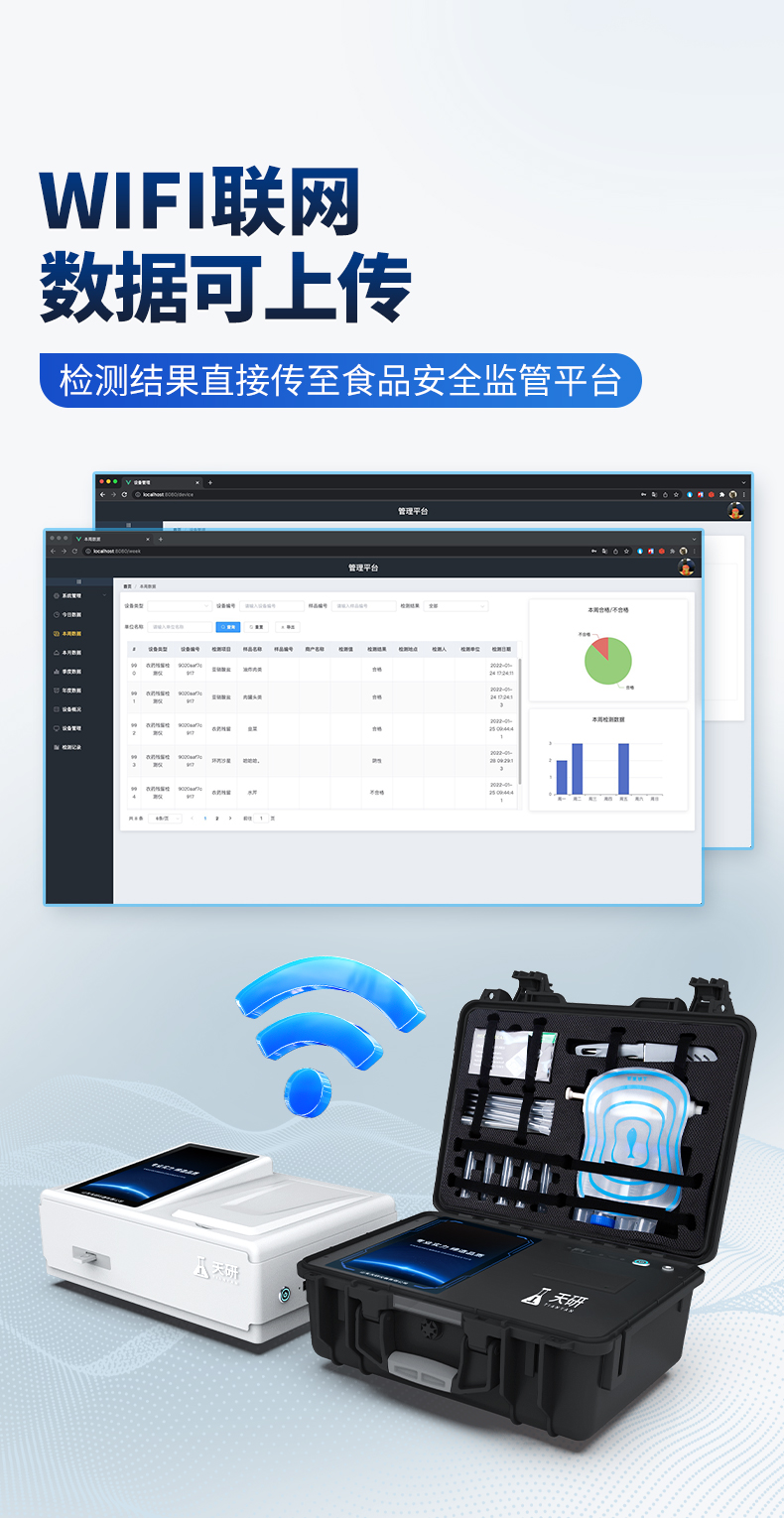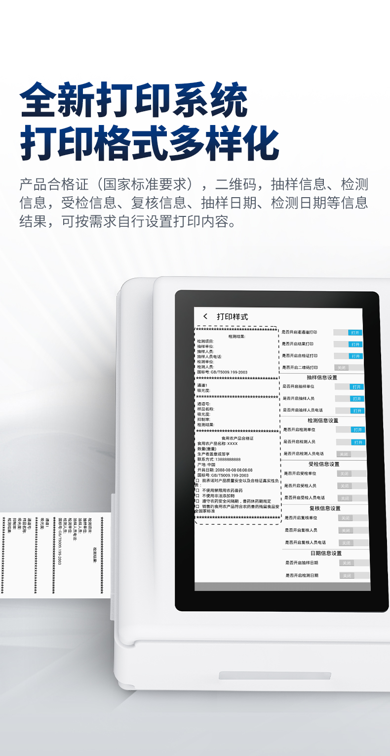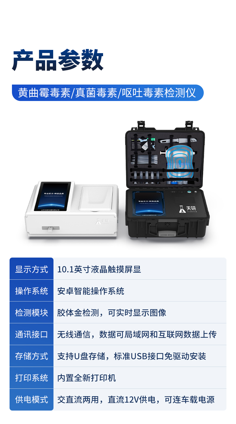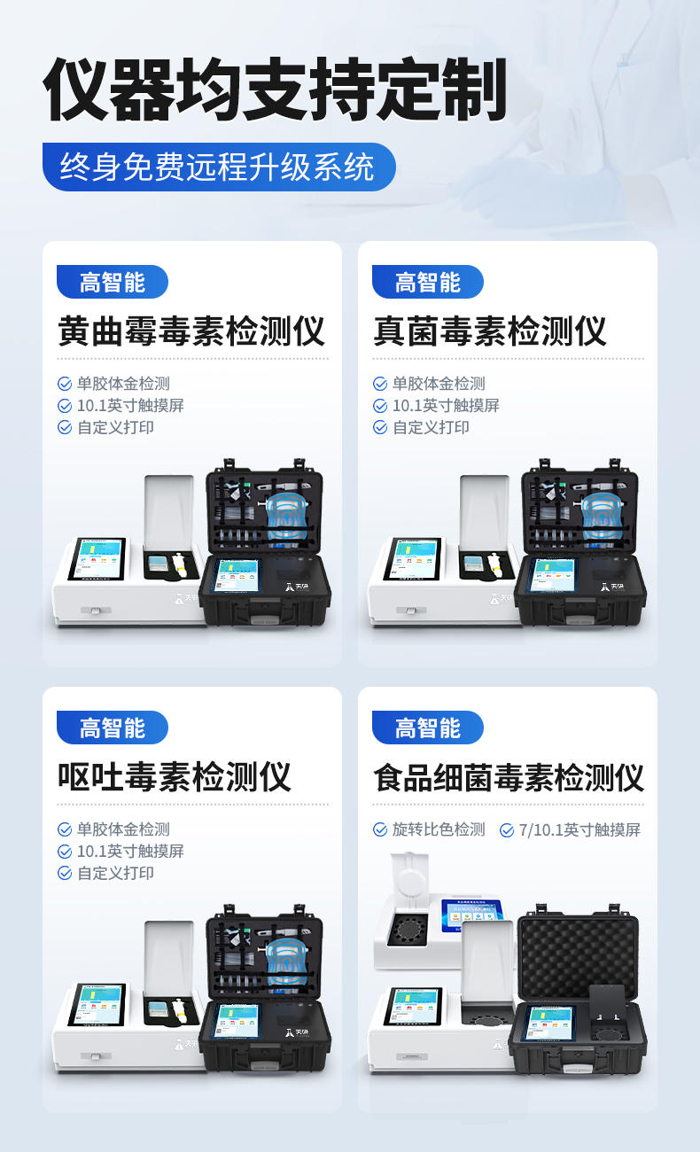 | 儀器采用手提一體化系統(tǒng)檢測(cè)技術(shù),將分光光度模塊、數(shù)字化管理模塊、無(wú)線通訊模塊高度集成于一體,可支持檢測(cè)60種食品安全檢測(cè)項(xiàng)目,同時(shí)預(yù)留升級(jí)檢測(cè)方法。 | 儀器檢測(cè)模塊標(biāo)準(zhǔn)化、智能化,檢測(cè)項(xiàng)目可隨意自由組合。檢測(cè)箱體內(nèi)置多個(gè)標(biāo)準(zhǔn)檢測(cè)單元,檢測(cè)模塊可以調(diào)整配置。 | 顯示屏幕:儀器采用10.1英寸豎向液晶觸摸屏顯,搭配運(yùn)行安卓智能操作系統(tǒng),主控芯片采用ARM Cortex-A7,RK3288/4核處理器,主頻1.88Ghz,操作方便,性能更強(qiáng)。 | 檢測(cè)通道:≥12通道;采用精密旋轉(zhuǎn)比色池設(shè)計(jì),使用同芯片同光源校準(zhǔn)精度,解決不同光源之間的誤差值,更加準(zhǔn)確**。(1-12通道間誤差0.1%,**號(hào):ZL202022821055.2) | 儀器光源:高精度進(jìn)口四波長(zhǎng)冷光源,每個(gè)通道均配置 410、520、590、630nm 波長(zhǎng)光源,標(biāo)配**的光路切換裝置,**光路切換功能可實(shí)現(xiàn)64波長(zhǎng),并且所有檢測(cè)項(xiàng)目可實(shí)現(xiàn)所有通道同時(shí)檢測(cè)。 | 設(shè)備可一鍵校準(zhǔn),自動(dòng)保存校準(zhǔn)數(shù)據(jù),自動(dòng)對(duì)比校驗(yàn),得到精準(zhǔn)光源,采用Android SP存儲(chǔ)數(shù)據(jù),光源數(shù)據(jù)永不丟失,方便每一次使用。 | 通訊接口:配備無(wú)線通信模塊、4G(APN)通訊模塊、藍(lán)牙傳輸,同時(shí)具有雙USB接口以及RJ45網(wǎng)線接口,可以多方式實(shí)現(xiàn)數(shù)據(jù)保存及數(shù)據(jù)傳輸。 | 存儲(chǔ)方式:支持U盤(pán)存儲(chǔ),標(biāo)準(zhǔn)USB接口,免驅(qū)動(dòng)安裝。檢測(cè)結(jié)果存儲(chǔ)容量20萬(wàn)條以上,可生成Excel表格進(jìn)行拷貝,并具有登錄保護(hù)功能。 | 智能化操作系統(tǒng): | 1、操作系統(tǒng):儀器可在同一檢測(cè)界面自動(dòng)對(duì)應(yīng)相關(guān)檢測(cè)通道,一次性選擇1-12個(gè)樣品名稱,無(wú)需退出界面,節(jié)省操作時(shí)間。并可以對(duì)每個(gè)通道屬性和樣品信息單獨(dú)進(jìn)行編輯,例如送檢單位、人員,檢測(cè)人員等,打印時(shí)勾選打印顯示。 | 2、數(shù)據(jù)集成系統(tǒng):設(shè)備首頁(yè)自動(dòng)匯總分析檢測(cè)數(shù)據(jù),包含:周檢測(cè)數(shù)據(jù)、月檢測(cè)數(shù)據(jù),全部檢測(cè)總數(shù)量,均包含檢測(cè)總數(shù),合格數(shù),不合格數(shù),以及相關(guān)柱形分析圖,各項(xiàng)檢測(cè)數(shù)據(jù)一目了然,無(wú)需電腦查詢,更加快捷直觀。 | 3、數(shù)據(jù)庫(kù)系統(tǒng):十幾項(xiàng)數(shù)據(jù)庫(kù)分類管理儀器:包含項(xiàng)目類型、項(xiàng)目數(shù)據(jù)、檢測(cè)數(shù)據(jù)、歷史記錄、國(guó)標(biāo)信息、曲線信息、采樣信息、檢測(cè)信息、受檢信息、復(fù)核信息、圖表信息、光源校準(zhǔn)信息、打印樣式信息、樣品庫(kù)信息等等,數(shù)據(jù)庫(kù)之間互相協(xié)調(diào)聯(lián)動(dòng)保證數(shù)據(jù)的真實(shí)完整性。同時(shí)產(chǎn)品數(shù)據(jù)庫(kù)以及歷史檢測(cè)記錄支持一鍵檢索功能。 | 4、限量規(guī)判系統(tǒng):具有限量查詢、添加物質(zhì)合規(guī)判定系統(tǒng)。檢測(cè)出結(jié)果后,系統(tǒng)自動(dòng)調(diào)用系統(tǒng)數(shù)據(jù)庫(kù)中相關(guān)國(guó)標(biāo)進(jìn)行比對(duì)判定,客觀顯示判定結(jié)果是否合格。 | 5、項(xiàng)目預(yù)設(shè)系統(tǒng):儀器具有任務(wù)預(yù)設(shè)模塊,一鍵提前預(yù)設(shè),給出方便快捷的新檢測(cè)方案,每一個(gè)任務(wù)分別可以設(shè)置不同的樣品、批次、編號(hào)、來(lái)源、備注、抽樣信息、檢測(cè)信息、受檢信息、復(fù)核信息等更多信息。樣品送檢時(shí)一鍵調(diào)取保存信息,并可多次調(diào)取,大大提高檢測(cè)效率。 | 6、數(shù)據(jù)監(jiān)管系統(tǒng):同步對(duì)接監(jiān)管平臺(tái),數(shù)據(jù)可局域網(wǎng)和互聯(lián)網(wǎng)數(shù)據(jù)上傳,檢測(cè)結(jié)果可選擇直接傳至食品安全監(jiān)管平臺(tái)。進(jìn)行區(qū)域食品安全監(jiān)管及大數(shù)據(jù)分析處理與數(shù)據(jù)統(tǒng)計(jì),檢測(cè)區(qū)域食品安全長(zhǎng)短期動(dòng)態(tài),達(dá)到食品安全問(wèn)題預(yù)估、預(yù)警。 | 7.1、全新打印系統(tǒng):內(nèi)置全新打印機(jī),新創(chuàng)自定義打印方式,可按需靈活勾選控制:二維碼,抽樣信息、檢測(cè)信息,受檢信息、復(fù)核信息、抽樣日期、檢測(cè)日期等信息的打印。 | 7.2、A4紙版本報(bào)告打印功能(可選配):設(shè)備擁有兩種結(jié)果展示方式,可以自動(dòng)生成A4打印模板和小票打印模板兩種樣式,可通過(guò)WiFi及網(wǎng)線等方式鏈接外置打印機(jī)可進(jìn)行打印。 | 供電模式:儀器交直流兩用,直流12V供電,可連接車載電源,可配6ah大容量充電鋰電池,電量可實(shí)時(shí)顯示,方便戶外流動(dòng)測(cè)試。 | 儀器具備遠(yuǎn)程升級(jí)功能,可定向分客戶分儀器更新,開(kāi)機(jī)后自動(dòng)更新,并可持續(xù)性免費(fèi)更新系統(tǒng)版本,無(wú)需像傳統(tǒng)產(chǎn)品返廠更新,節(jié)省時(shí)間及人力成本并避免了物流運(yùn)輸返廠升級(jí)導(dǎo)致設(shè)備損壞的潛在風(fēng)險(xiǎn)。 |
