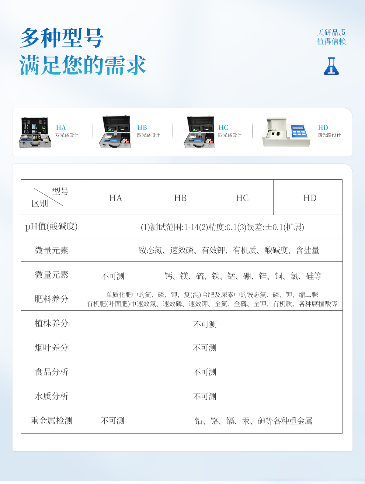 | 升級款,噴塑鋼板外殼設計,堅固耐用,配套成套附件及成品藥劑。 | 微電腦控制,數字化線路、程序化設計,液晶顯示,交直流兩用,可野外流動測試。 | 分辨率:0.001,觸摸式按鍵,內置新一代熱敏打印機,可打印測試結果。 | 肥料養(yǎng)分專用檢測儀可檢測化肥、有機肥(含葉面肥、水溶肥、噴施肥等)中的速效氮、速效磷、有效鉀、全氮、全磷、全鉀、有機質、酸堿度,鈣、鎂、硫、鐵、錳、硼、鋅、銅、氯、硅等各種中微量元素以及鉛、鉻、鎘、汞、砷等各種重金屬含量。 | 采用高亮LED燈光源、雙撥輪濾光式處理技術,保證光源波長穩(wěn)定, 硅半導體作為信號接收系統(tǒng),壽命長達10萬小時級別。光源穩(wěn)定,重現(xiàn)性好,準確度高。 | 比色槽部分采用單通道設計,無機械位移及磨損,光路測試定位**,保證測定結果精度。 | 采用自主分析方法(號:ZL 2018 2 1777724.7),保證檢測結果絕對達到國標要求。 | 內置熱敏打印機,肥料打印結果為百分含量,測試誤差小于0.5%。 |