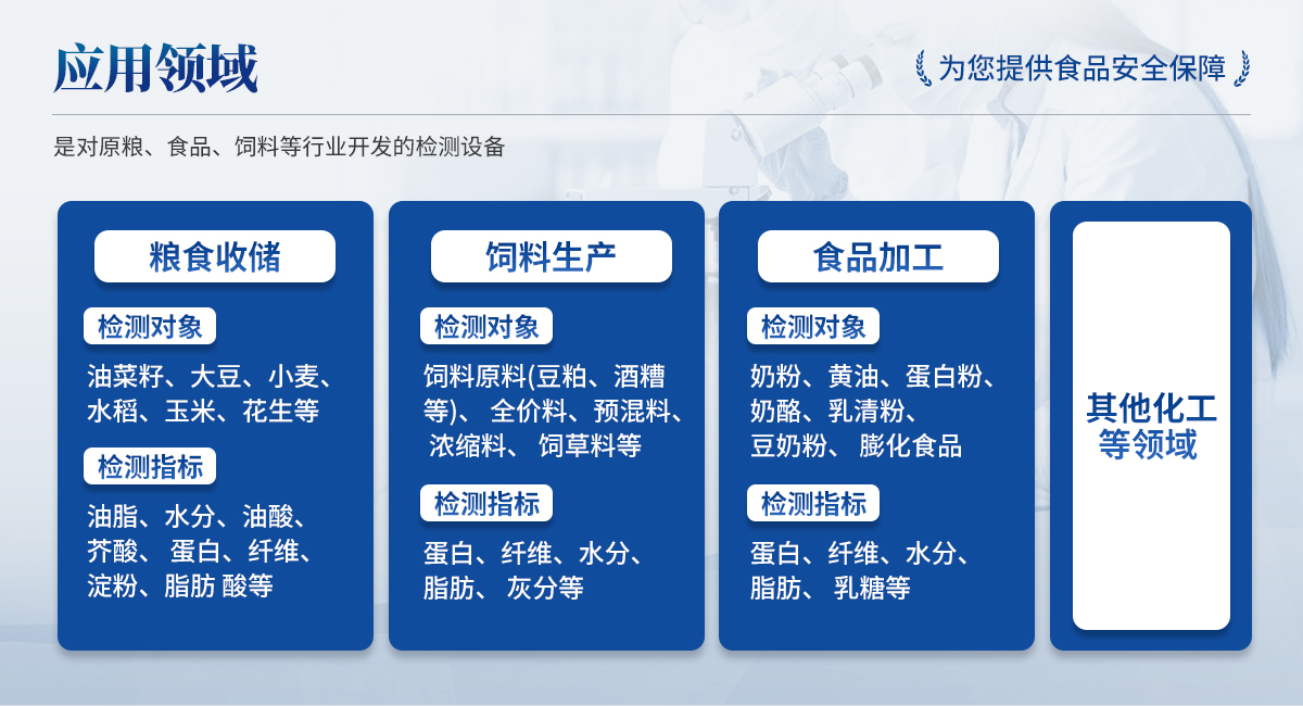 檢測對象:飼料原料(豆粕、酒糟等)、全價料、預(yù)混料、濃縮料、飼草料等 檢測指標(biāo):蛋白、纖維、水分、脂肪、灰分等; | ◆ 食品加工: