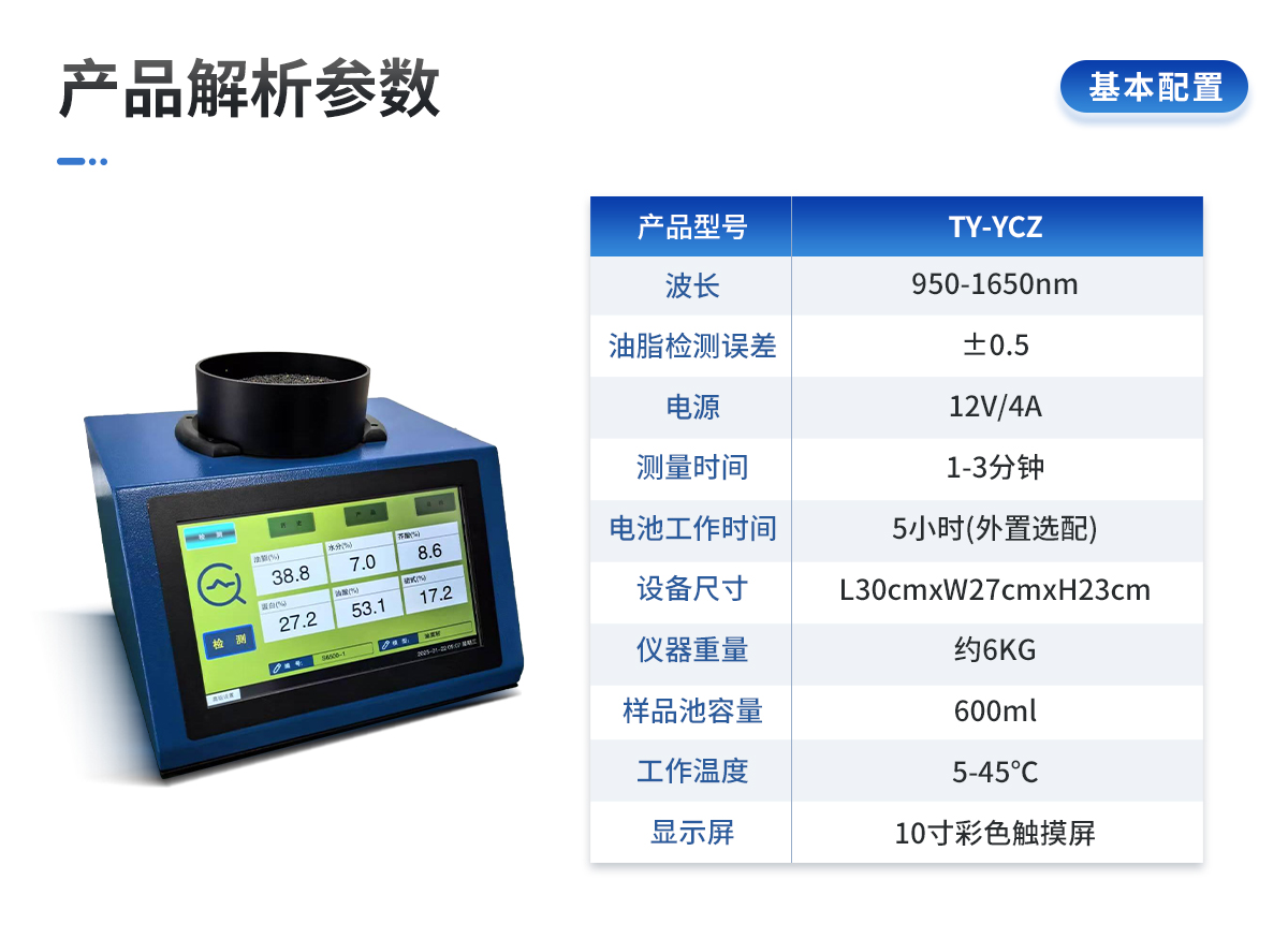 | 波長范圍:950-1650nm | 測量對象:顆粒、粉末、草料等固形物 | 測量時間:1~3 分鐘(因檢測對象及指標(biāo)而異) | 樣品池容量:600ml | 尺寸及重量:L30cm×W27cm×H23cm(含樣品池高度),6kg | 操作界面:10 寸彩色觸摸屏 | 供電電壓:12V/4A | 電池工作時間:5 小時(外置選配) | 工作溫度:5-45℃ | 油脂檢測誤差:+-0.5 |
