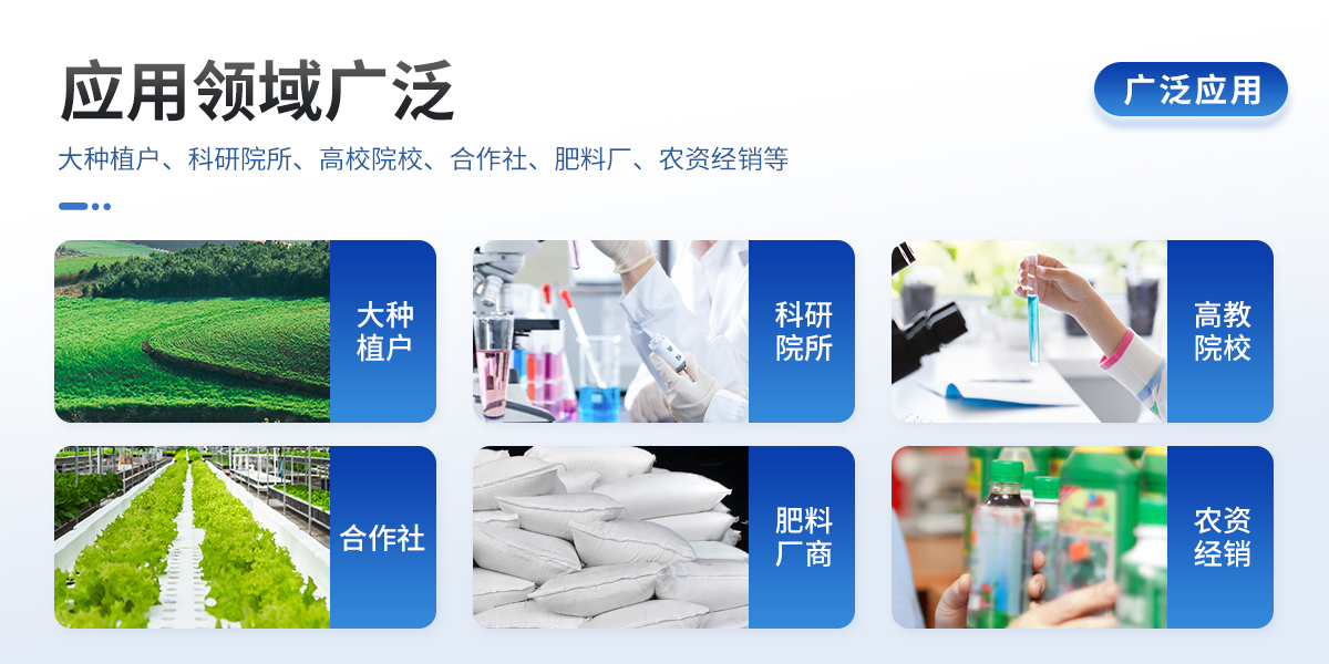 | 配套齊全:該儀器無需用戶自配附件,相當(dāng)于一個小型實驗室。適于農(nóng)業(yè)服務(wù)部門或農(nóng)資經(jīng)銷商、合作社、肥料廠商、大種植戶測土施肥。 | 檢測功能全:測試項目國內(nèi)外全面,除標配試劑外,其他各類藥劑均可加配選購。 | 操作簡便、速度快捷,配套整套附件及成品藥劑開瓶即用,無須配置。 |