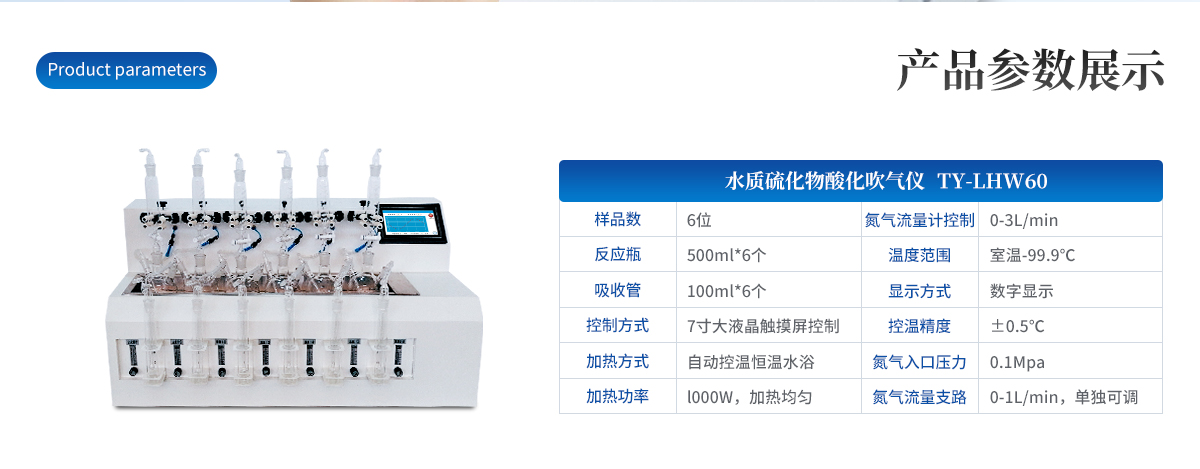 水樣中的硫化物經(jīng)酸化,生成的硫化氫隨載氣(氮?dú)猓┻M(jìn)入吸收瓶/吸收顯色管中被吸收溶液(乙酸鋅-乙酸鈉溶液或2%氫氧化鈉溶液)吸收,選擇相應(yīng)的分析方法對吸收瓶/吸收顯色管中吸收的硫離子進(jìn)行分析測定。水質(zhì)硫化物酸化吹氣儀根據(jù)2022年新國標(biāo)水質(zhì)硫化物的測定-亞甲基藍(lán)分光光度法(典量法)標(biāo)準(zhǔn)開發(fā)生產(chǎn)的。水質(zhì)硫化物測定的樣品前處理需要。