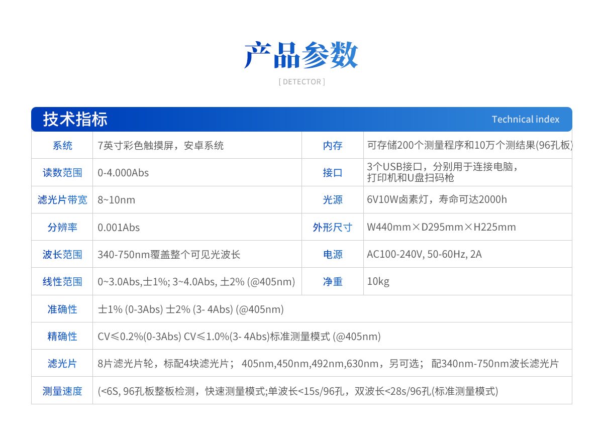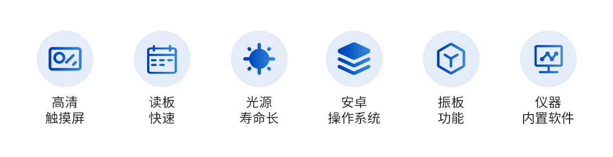 | 1. 高清觸摸屏: 顯示使用7英寸彩色觸摸屏,分辨率為1280*800像素。 | 2.內(nèi)置軟件: 內(nèi)置軟件可提供儀器的控制和數(shù)據(jù)分析,可直接外接U盤。 | 3. 光源壽命長: 光源采用6V10W鹵素燈,壽命可達2000h。 | 4. 讀板快速: 采用單波長,雙波長檢測讀板快速。 | 5. 振板功能: 根據(jù)使用配置了振板功能,可根據(jù)使用設置振板時間和速度。 | 6. 操作系統(tǒng): 配備自主研發(fā)的安卓操作系統(tǒng)可單機獨立使用,同時配置多種數(shù)據(jù) 輸出接口,方便不同的數(shù) 據(jù)傳輸和處理。 | 7. 可視化布板: 并采用可視化布板方式輸出測試結果。 | 8. 設置吸光度范圍:0~4.000Abs,滿足不同測量要求,并配備了8組濾光片輪,標配4組濾光片,根據(jù)使用 可選配340 nm~750nm波長的濾光片組合使用。設計合理無需打 開機蓋就可更換光源和濾光片。 | 9.檢測數(shù)據(jù):使用自動校準、定位系統(tǒng)算法使檢測數(shù)據(jù)更精準、可靠。 | 10. 配置對光路: 配置對光路,機械運動等進行自檢和診斷校對功能。 |