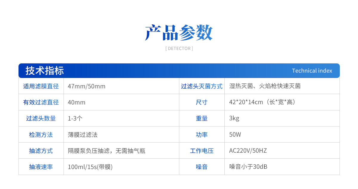 | 1、適用濾膜直徑:47mm/50mm 2、有效過(guò)濾直徑:40mm 3、過(guò)濾頭數(shù)量:1-3個(gè) 4、檢測(cè)方法:薄膜過(guò)濾法 5、抽濾方式:隔膜泵負(fù)壓抽濾,無(wú)需抽氣瓶 6、抽液速率:100ml/15s(帶膜) 7、過(guò)濾頭滅菌方式:濕熱滅菌、火焰槍快速滅菌 8、尺寸:42*20*14cm(長(zhǎng)*寬*高) 9、重量:3kg 10、功率:50W 11、工作電壓:AC220V/50HZ 12、噪音小于30dB 13、物理按鈕開(kāi)關(guān) 14、可選擇三頭、六頭結(jié)構(gòu),選型豐富 |