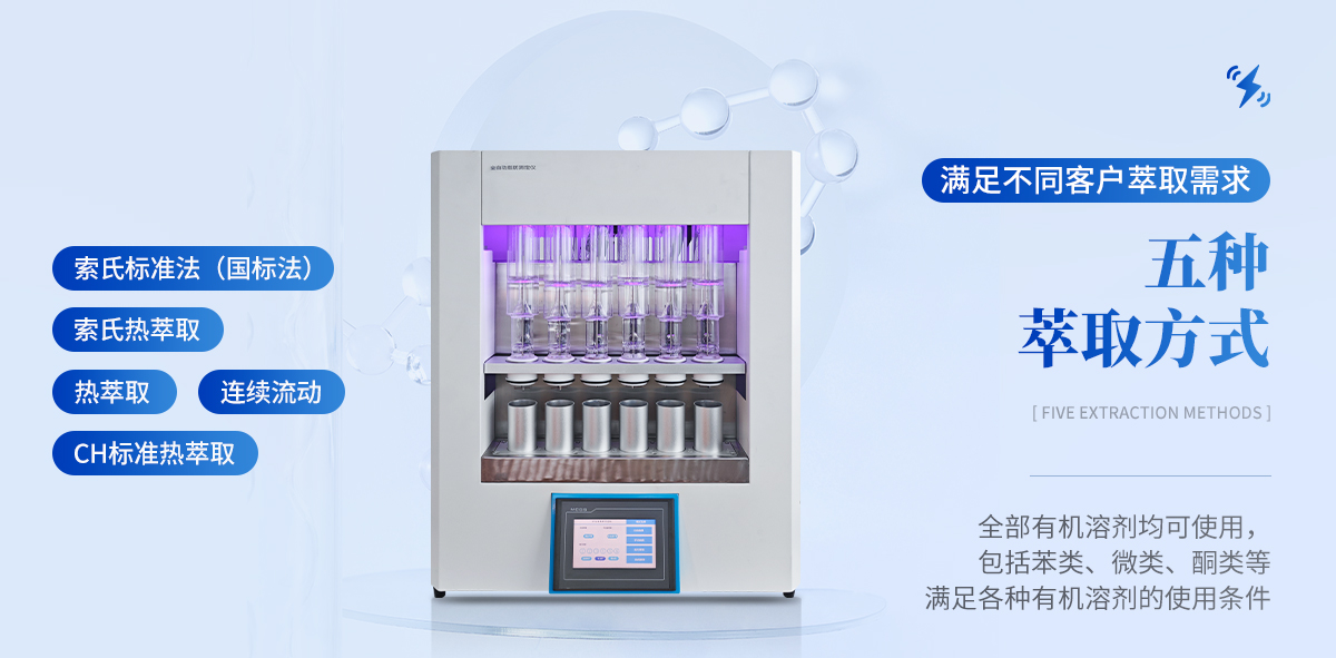 全自動(dòng)脂肪測(cè)定儀(索氏提取儀)是根據(jù)索氏抽提原理,對(duì)脂肪等有機(jī)物進(jìn)行萃取分離的儀器。儀器具有索氏標(biāo)準(zhǔn)法(國(guó)標(biāo)法)、索氏熱萃取、熱萃取、連續(xù)流動(dòng)及CH標(biāo)準(zhǔn)熱萃取等五種萃取方式;采用整體嵌入式金屬加熱,升溫快, 效果好,功耗低。安卓風(fēng)格界面設(shè)計(jì),豎屏外置壁掛式控制器,使操作更加簡(jiǎn)便快捷;進(jìn)出水路全方位溫度監(jiān)控與流量控 制,更加環(huán)保與節(jié)約;內(nèi)置乙謎泄漏檢測(cè) 裝置有效防止空氣污染,充分保障了實(shí)驗(yàn)的安全性。