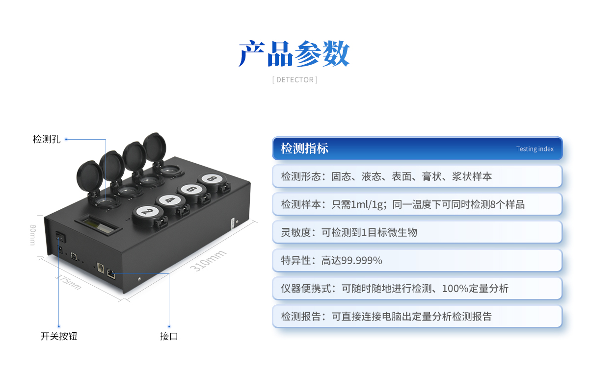 | 1) 可檢測(cè)固態(tài)、液態(tài)、表面、膏狀、漿狀樣本 | 2) 樣本在檢測(cè)時(shí)無需任何的前處理過程,直接丟入檢測(cè)瓶即可 | 3) 可自動(dòng)控制孵育溫度和孵育時(shí)間 | 4) 檢測(cè)樣本只需1ml/1g;同一溫度下可同時(shí)檢測(cè)8個(gè)樣品 | 5) 靈敏度高達(dá)可檢測(cè)到1目標(biāo)微生物;特異性高達(dá)99.999% | 6) 獨(dú)立、持續(xù)的檢測(cè)并記錄瓶中的微生物數(shù)量(CFU) | 7) 簡(jiǎn)單三個(gè)操作步驟,傻瓜型,無需專業(yè)操作人員 | 8) 儀器便攜式,可隨時(shí)隨地進(jìn)行檢測(cè)、100%定量分析,并可直接連接電腦出定量分析檢測(cè)報(bào)告 |